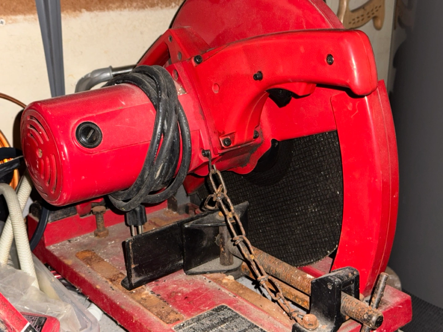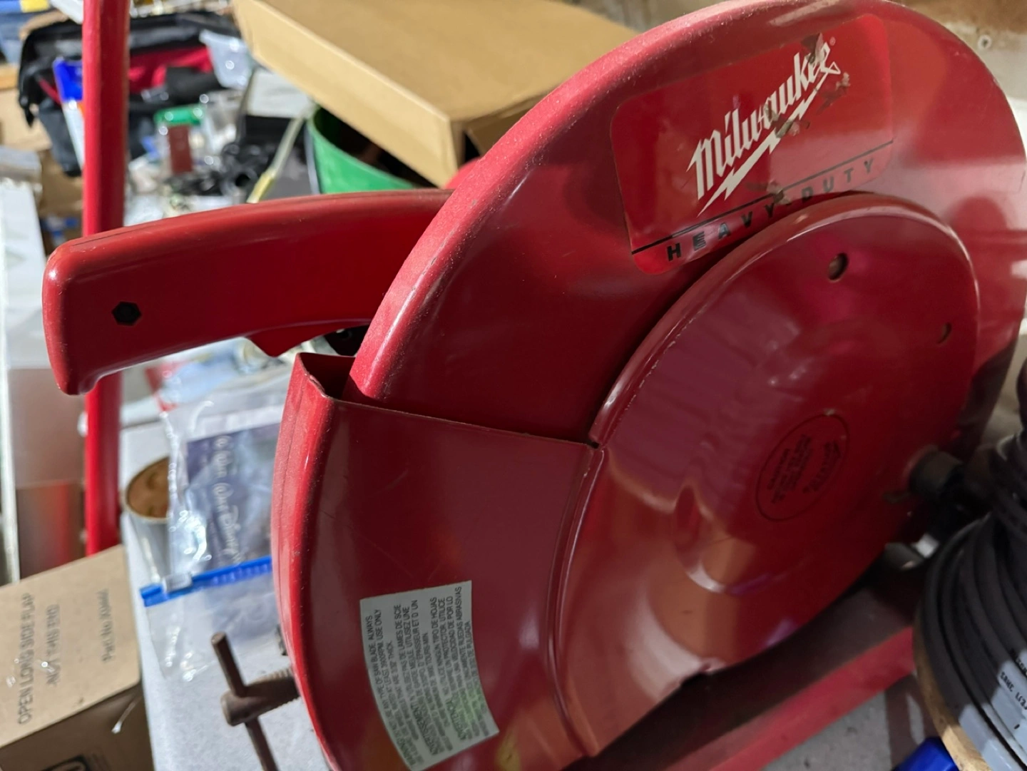 Red Milwaukee heavy duty cut-off saw. Power cord included. Shows some wear.