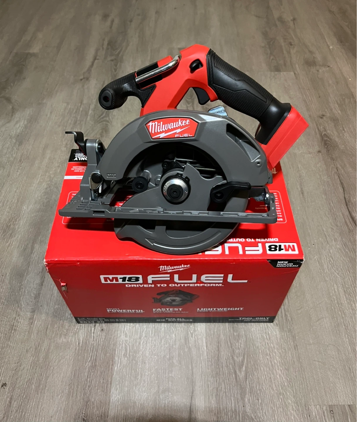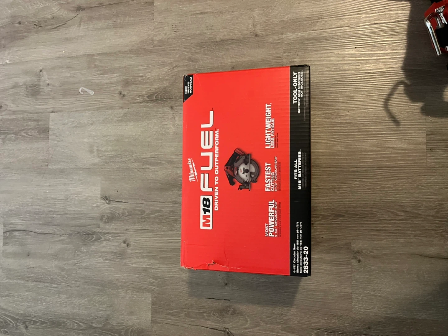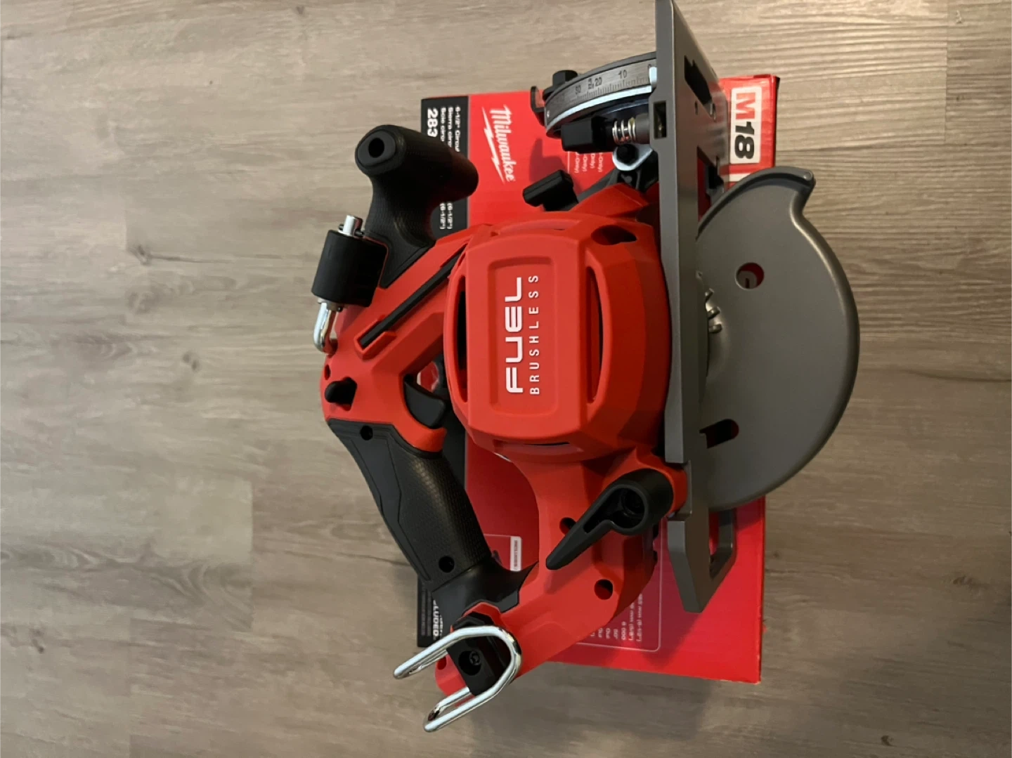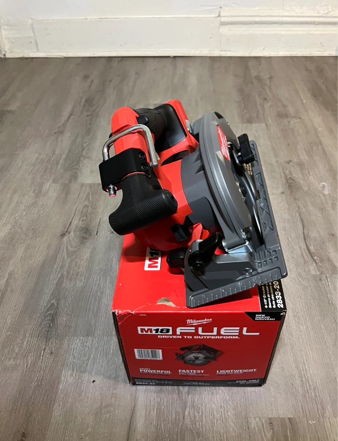 18Selling a brand new Milwaukee M18 FUEL circular saw 6 1/2 model 2833-20! comes in the original box. The box highlights that it's powerful, fast cutting, and lightweight. Fits all M18 batteries