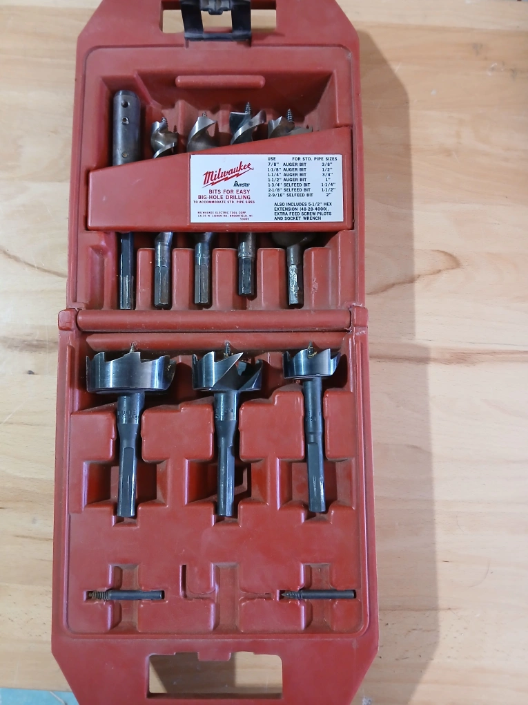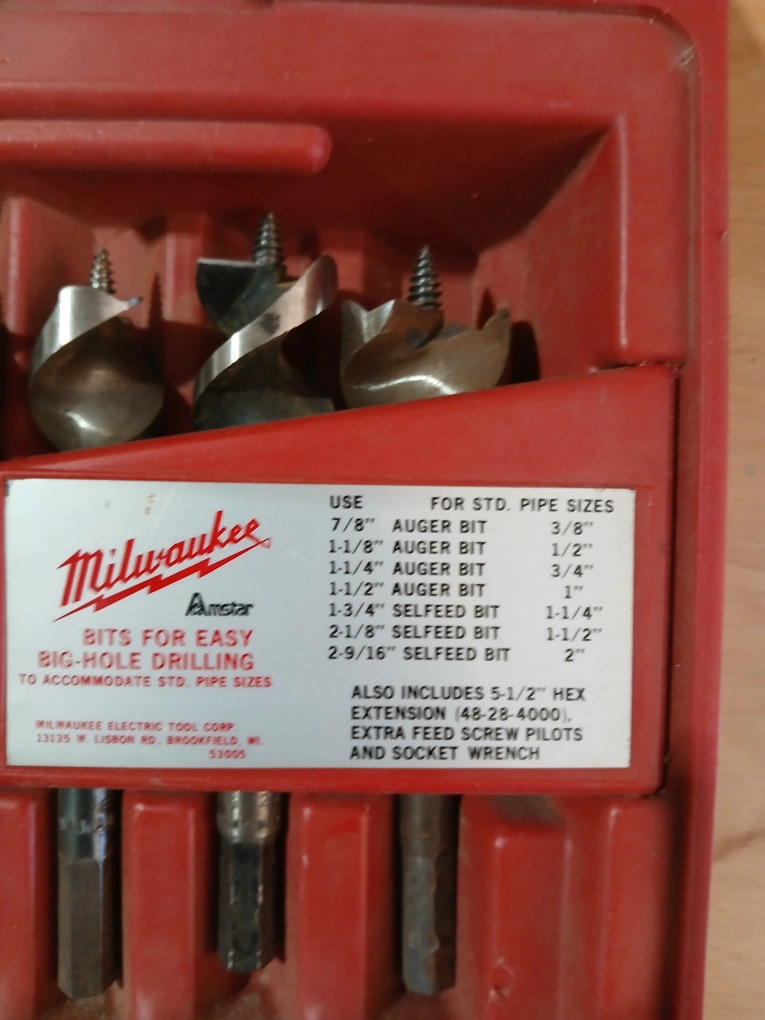 Milwaukee Amstar Plumbers Bit Kit for easy big-hole drilling. Includes various auger bits for standard pipe sizes, a 5-1/2" hex extension, extra feed screw pilots, and a socket wrench. Comes in a heavy-duty red case