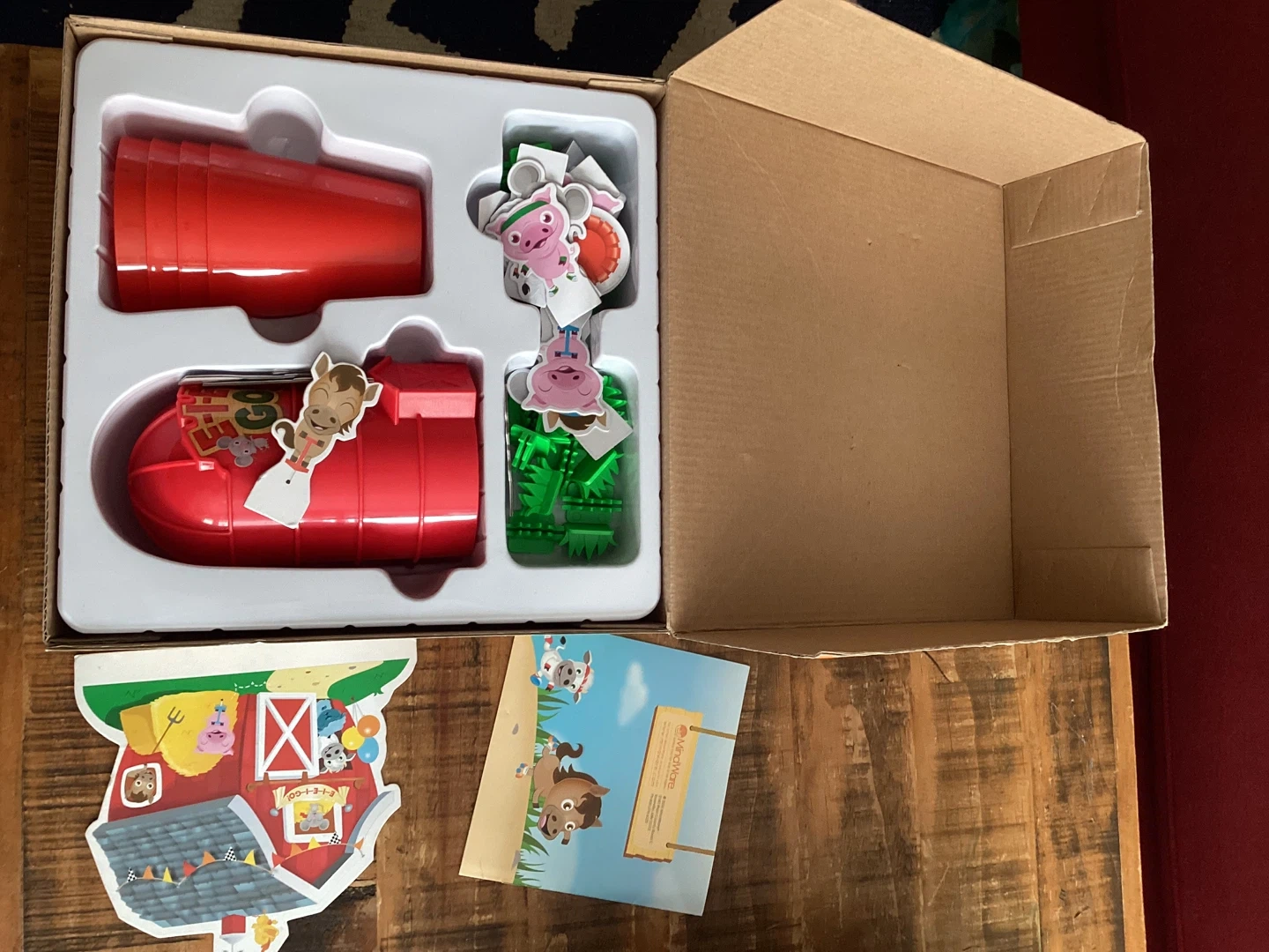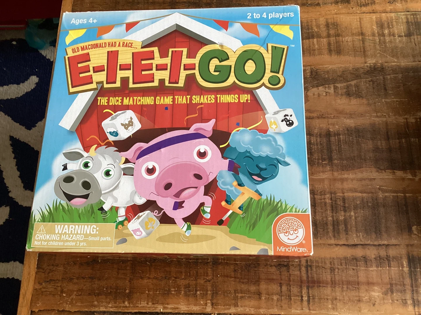 Selling a gently used MindWare E-I-E-I-GO! dice matching game, perfect for ages 4+. It's a fun and fast-paced game where players roll dice to match animal sets. The game includes 20 wooden animals, 4 dice, 4 shaker cups, 1 barn cutout, and instructions. Get ready for some Old MacDonald-themed fun!