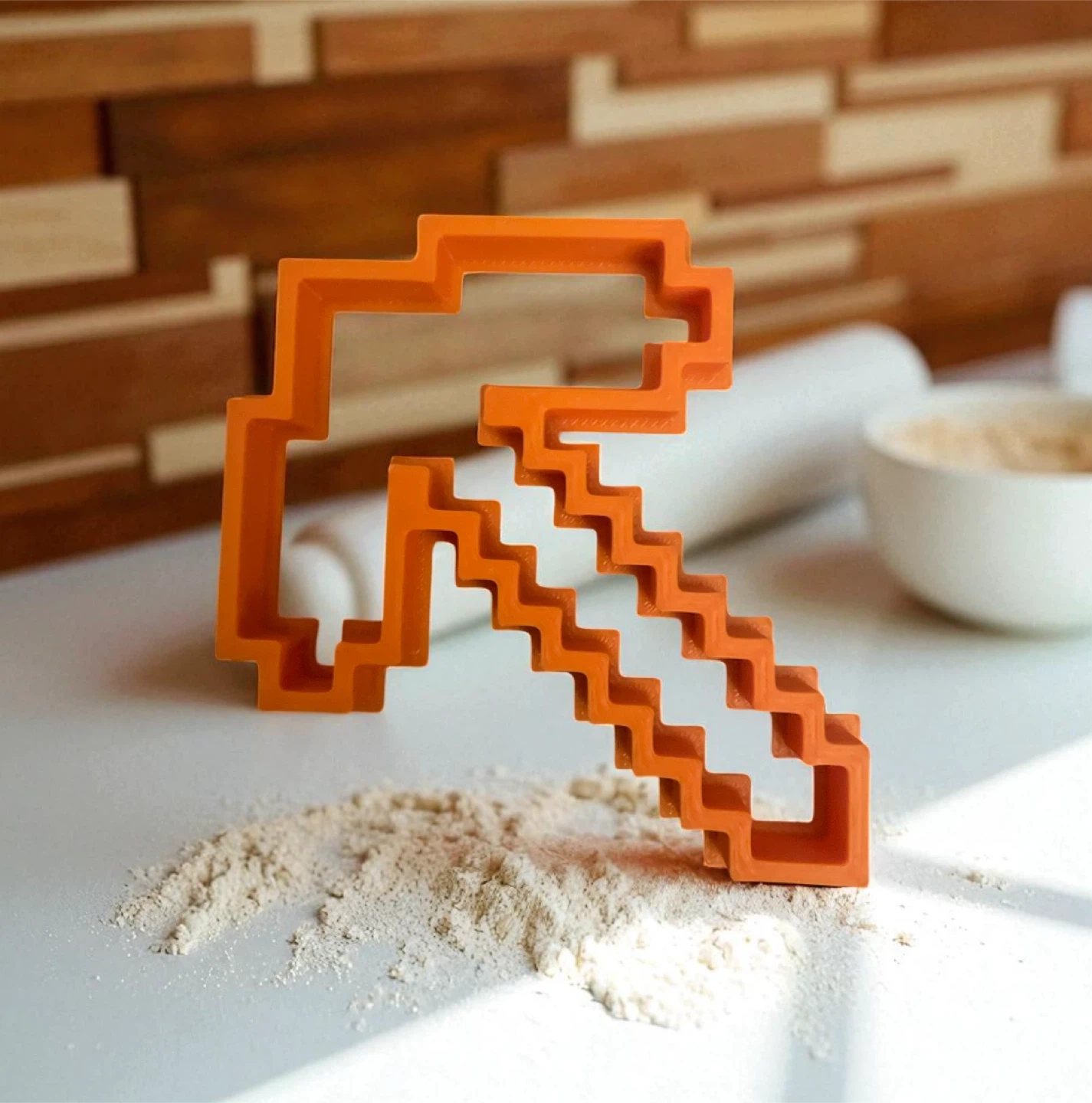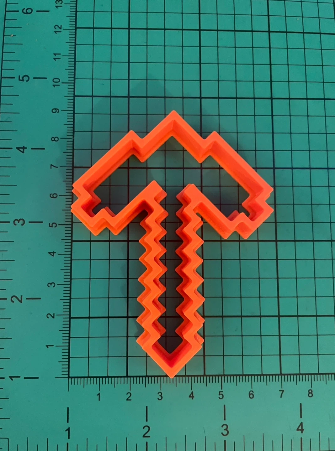 Here's a fun Minecraft pickaxe cookie cutter! It's in great condition and ready for your next baking adventure. The cutter is orange and shaped like the iconic pickaxe from the game Minecraft
