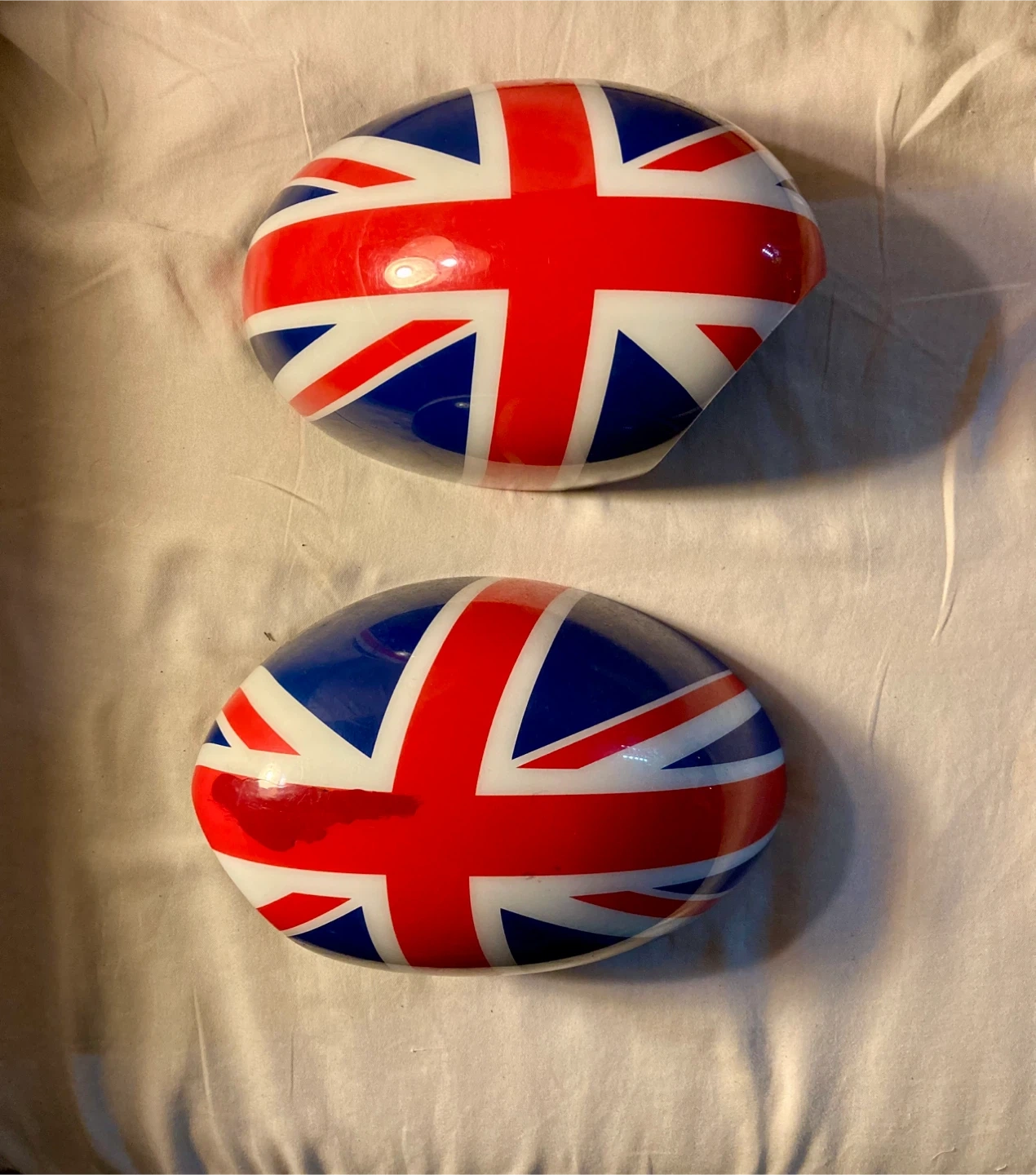 These are Mini Cooper mirror caps with the Union Jack design! They're in good condition and ready to add a touch of British flair to your ride