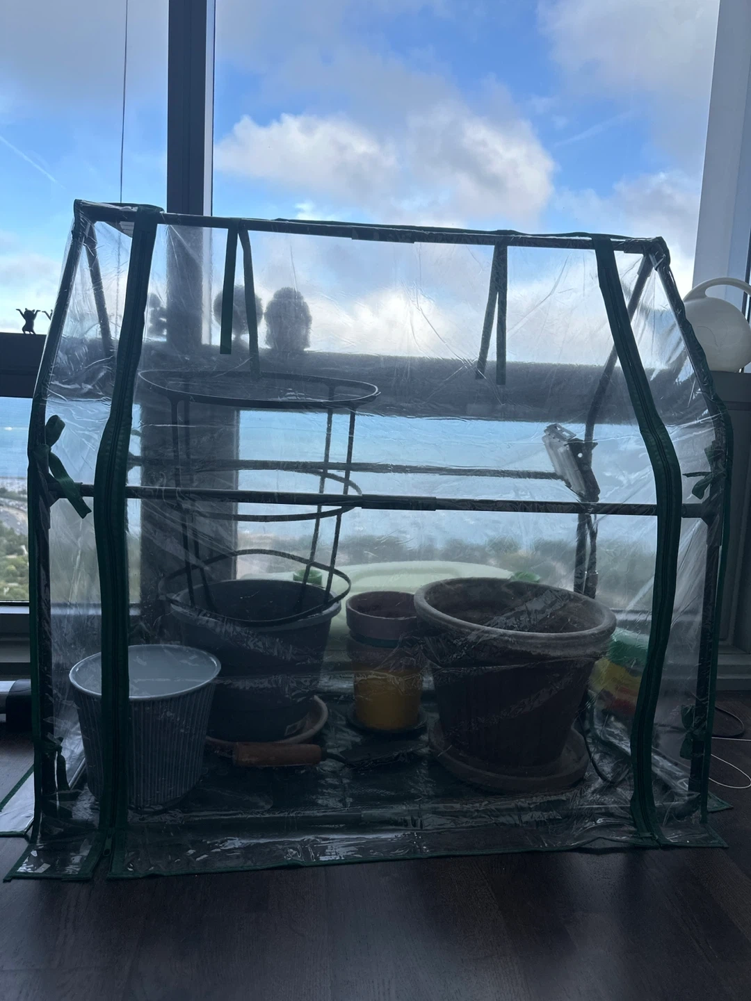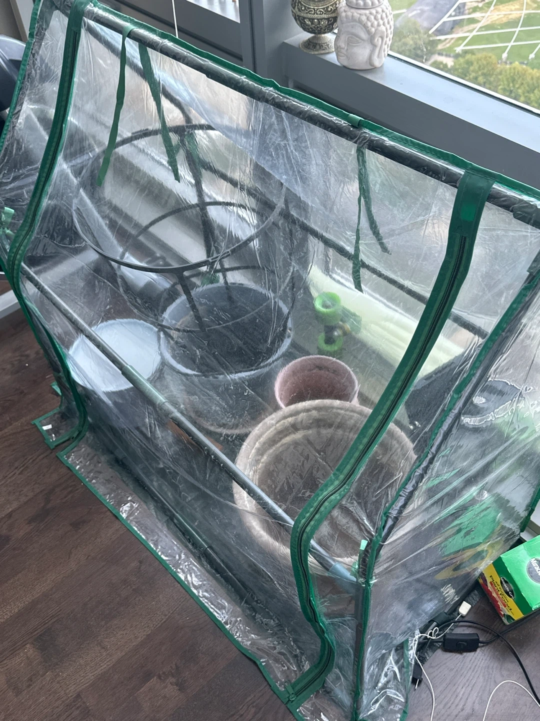I'm selling a mini greenhouse! It's perfect for starting seeds or protecting plants from the elements. It's in great condition and ready to use. Color is green & black