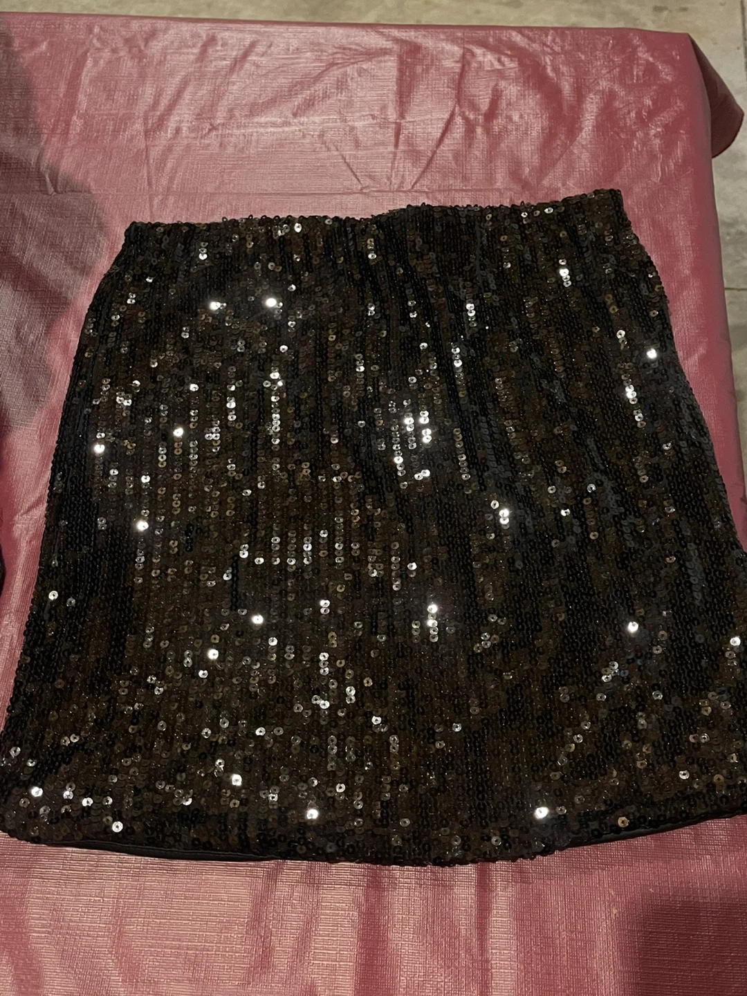 Selling a cute black sequin mini skirt! It's perfect for a night out or a fun party. The sequins add a touch of sparkle and make it a real eye-catcher