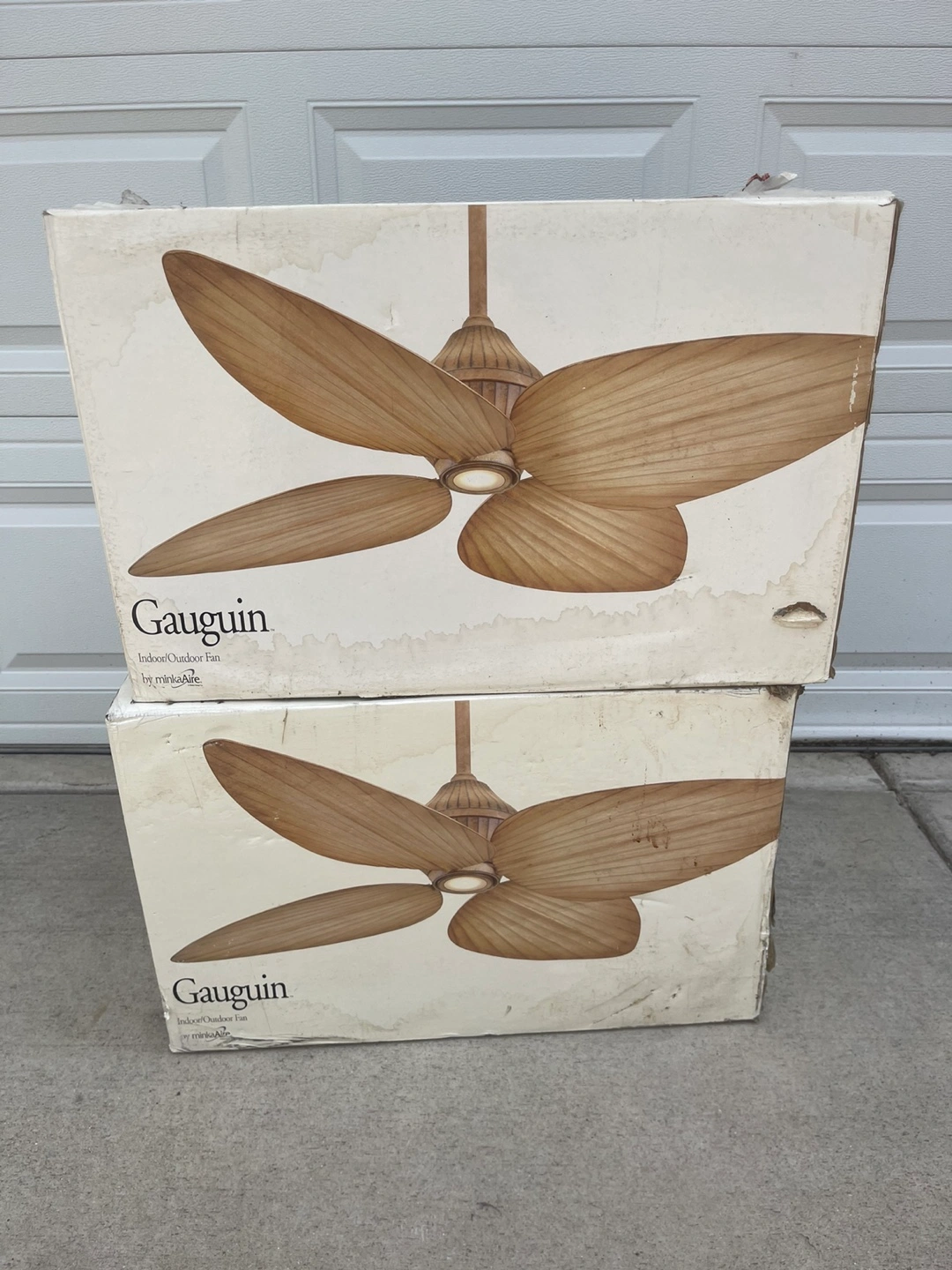 Selling a Minka Aire Gauguin indoor/outdoor ceiling fan. The box shows the fan with its unique wooden-style blades. Perfect for adding a touch of tropical style to your home!