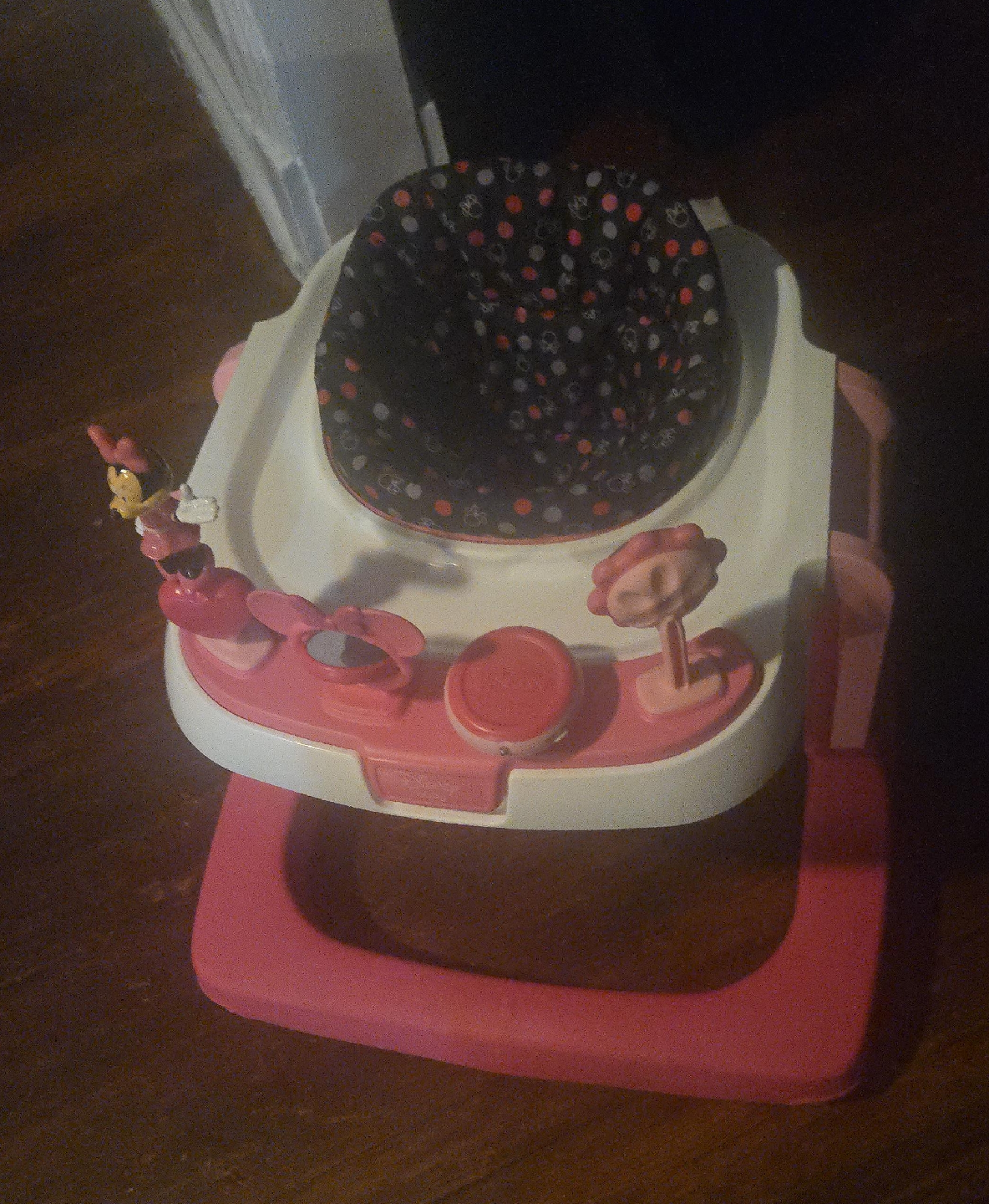 83Here's a cute Minnie Mouse baby walker! It's pink and white and has a polka dot seat. It's in great condition and ready for a new home!