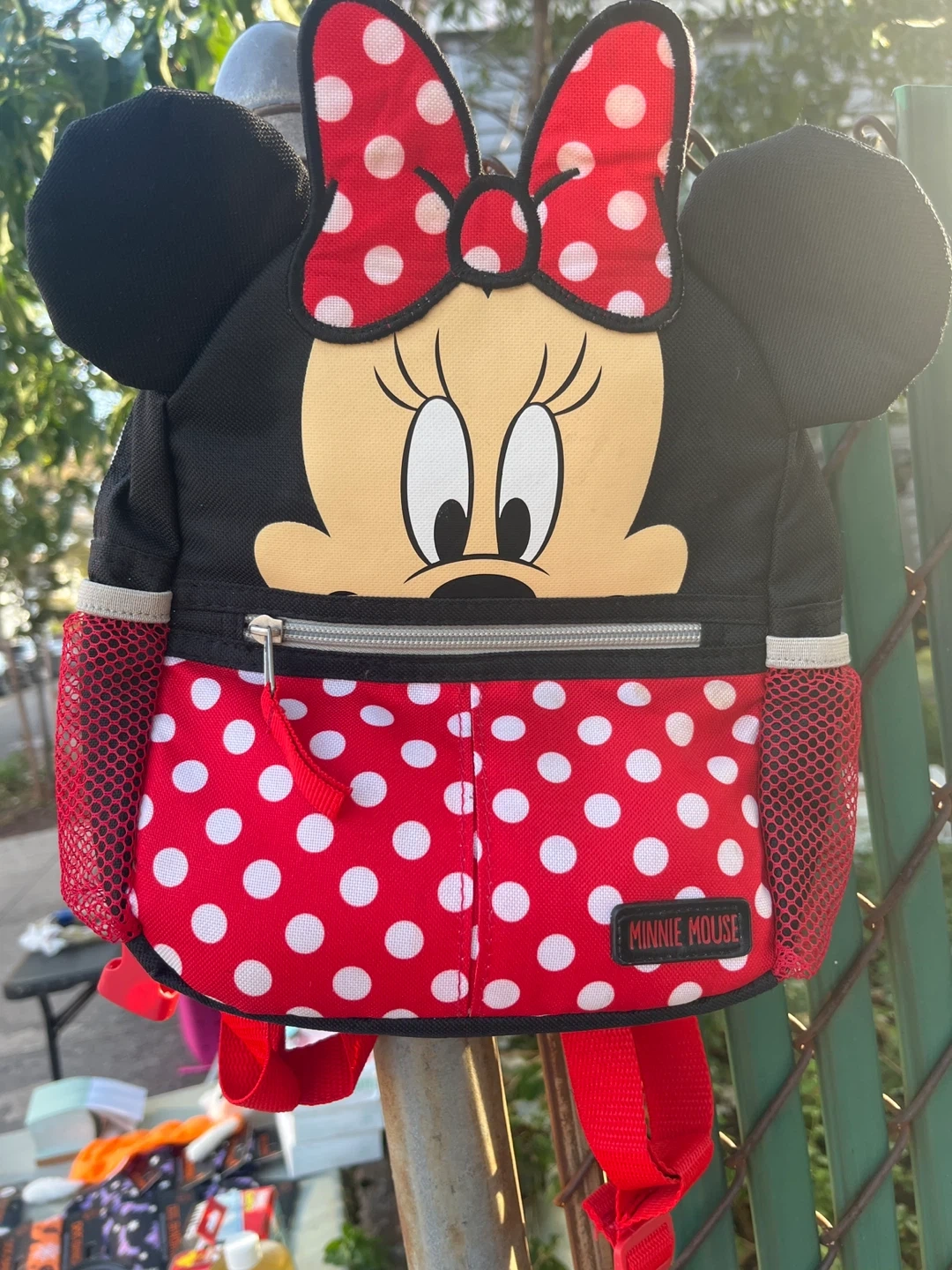 60Super cute Minnie Mouse backpack! It's red and black with polka dots and a zipper pocket. Perfect for a little one!