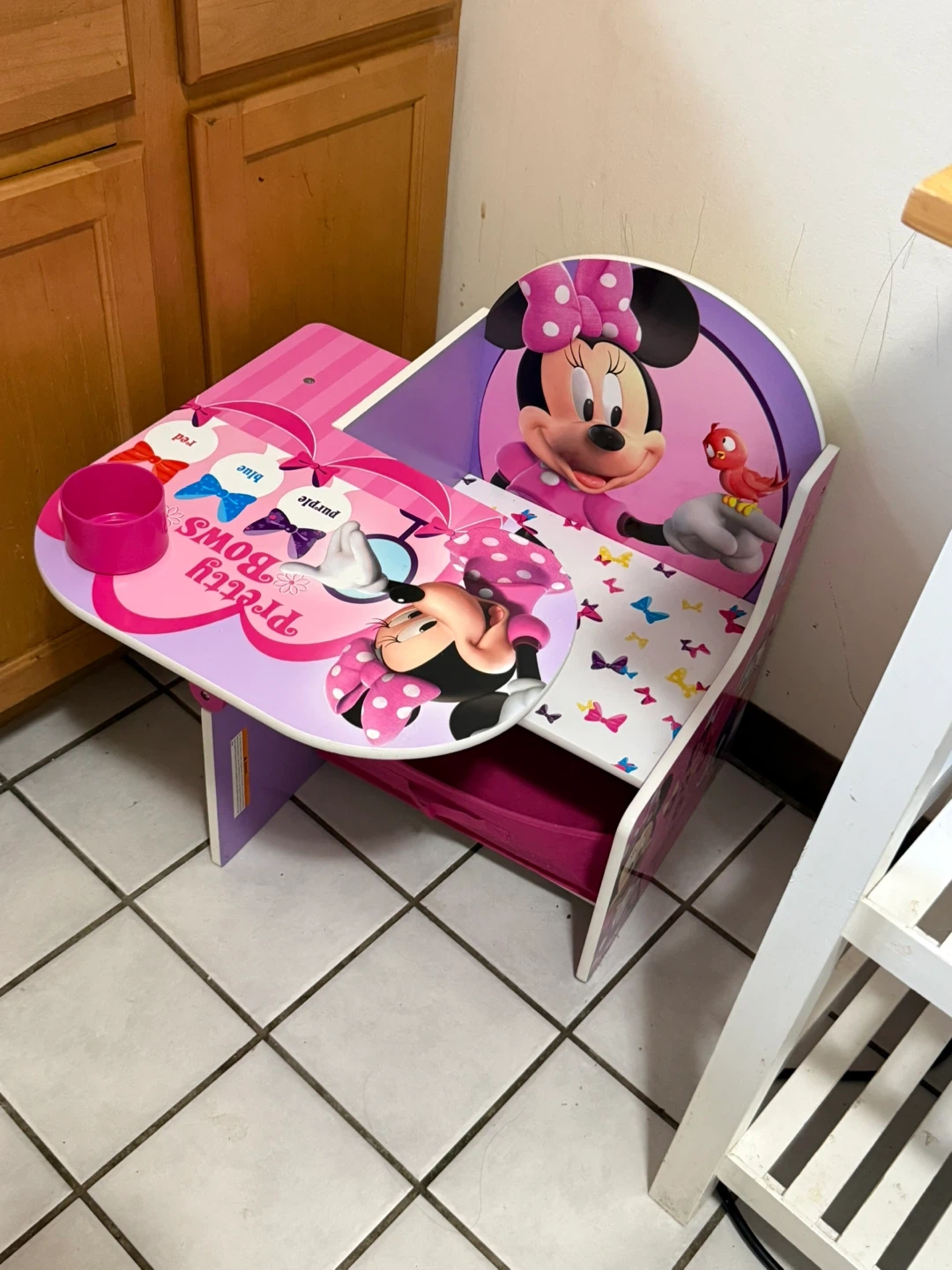 Selling a super cute Minnie Mouse desk and chair! It's perfect for a little one's room or play area. The desk features a fun Minnie Mouse design with a built-in cup holder and a storage bin underneath the chair. It's in good condition and ready for a new home!