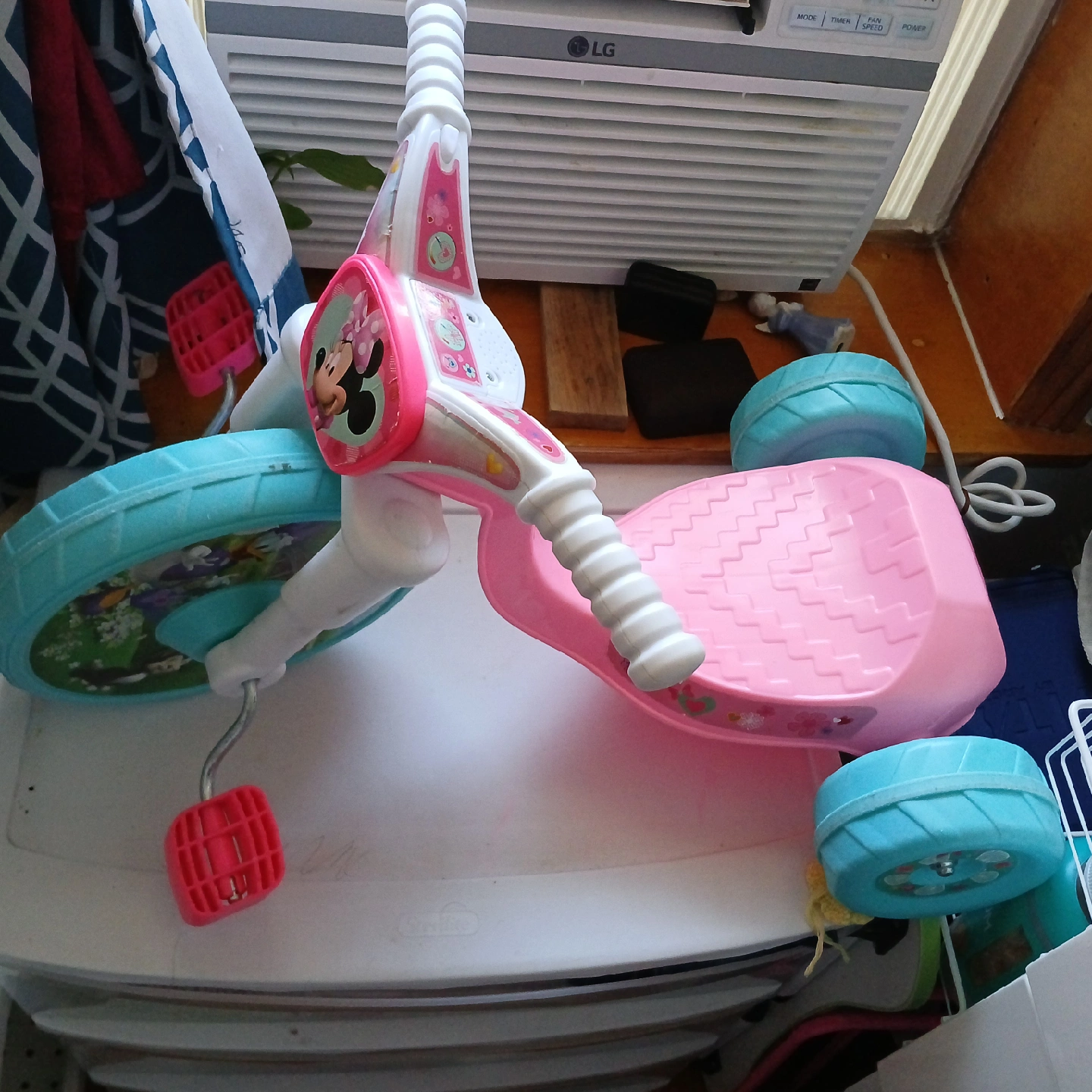 This is a cute Minnie Mouse themed trike in pink and blue!. It features Minnie Mouse details .