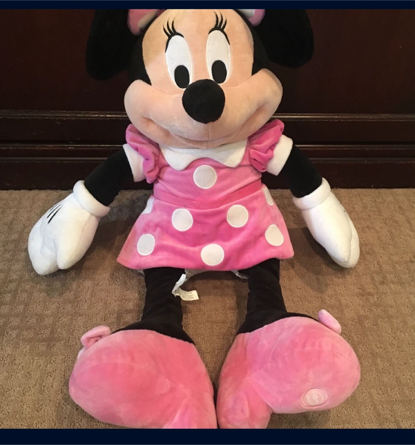 Selling a large Minnie Mouse plush doll! She's wearing her signature pink dress with white polka dots and matching bow. Perfect for any Disney fan or as a cuddly companion