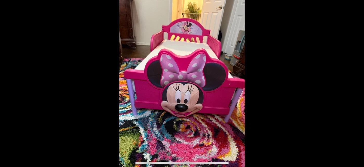5Here is a cute Minnie Mouse toddler bed! It's in good condition and perfect for a little one transitioning from a crib to a bed. The bed features Minnie Mouse details on the headboard and footboard, making it a fun addition to any child's room