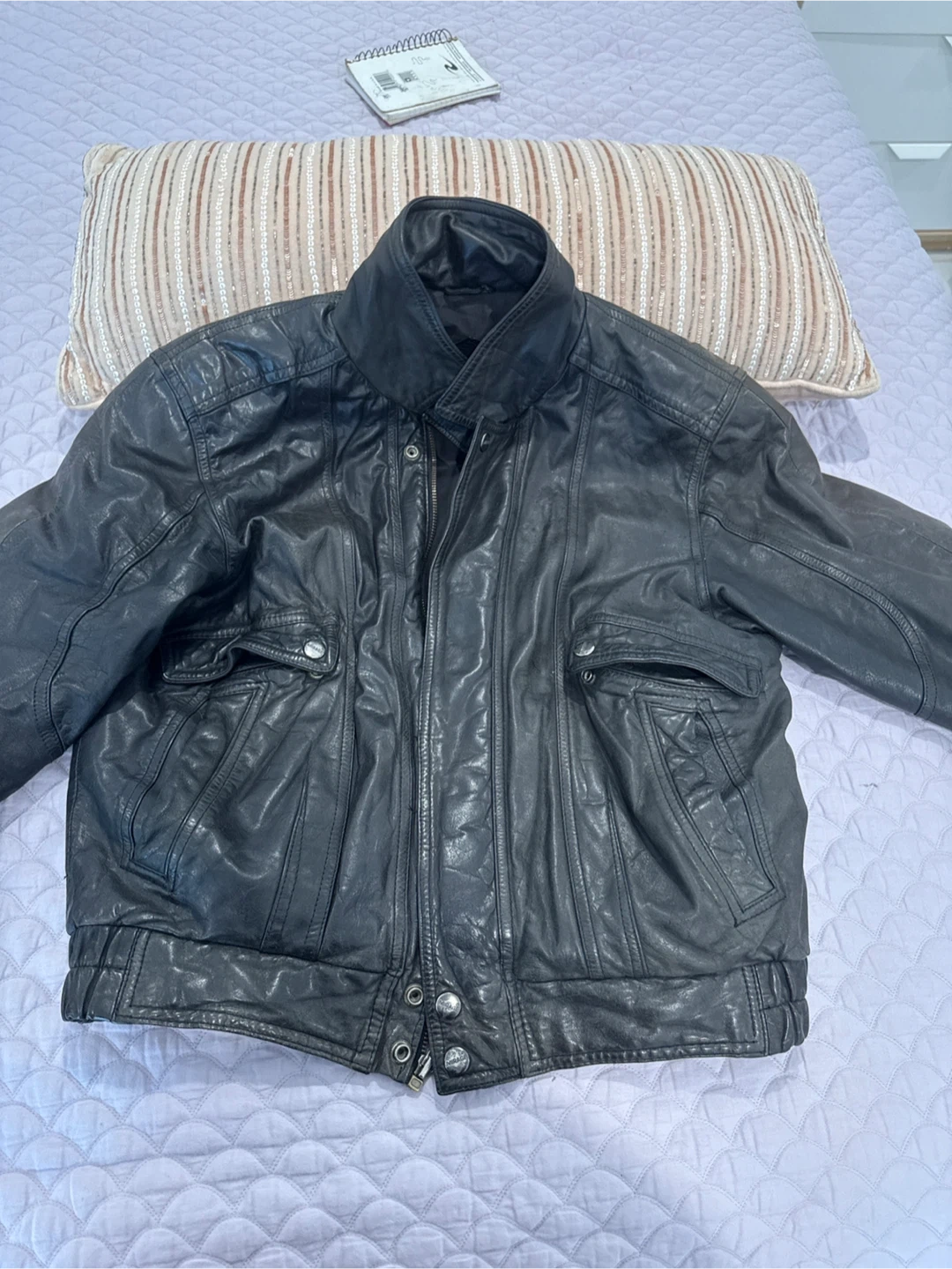 Here's a cool black leather jacket from Mirage! It has a classic design with multiple pockets and a full zip closure. The jacket is made of leather and is a stylish addition to any wardrobe