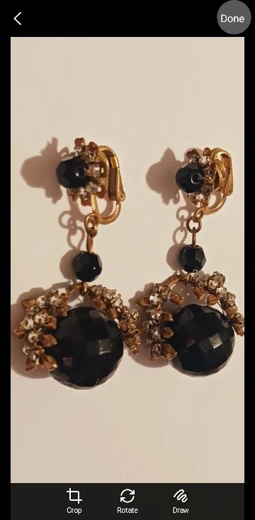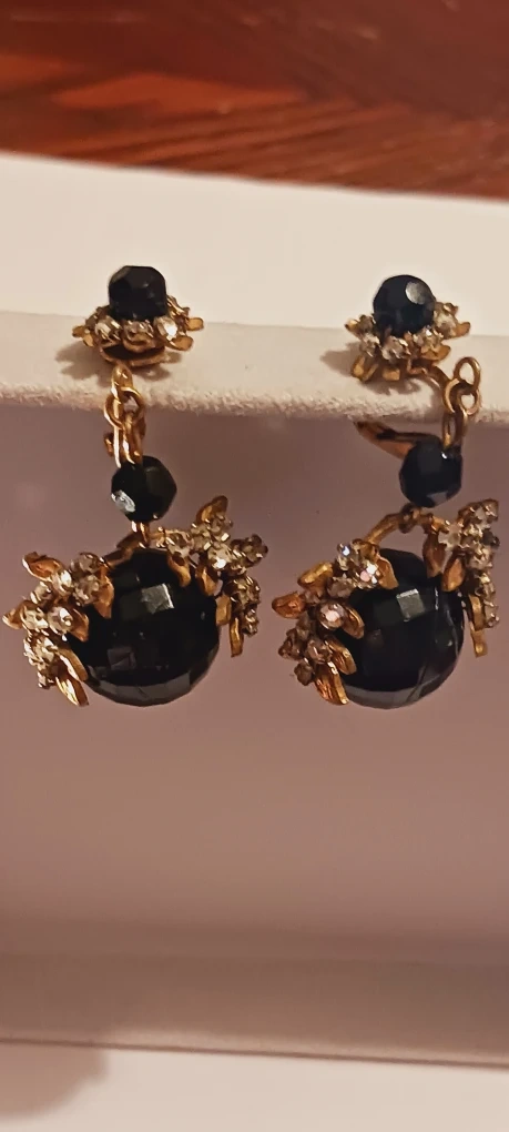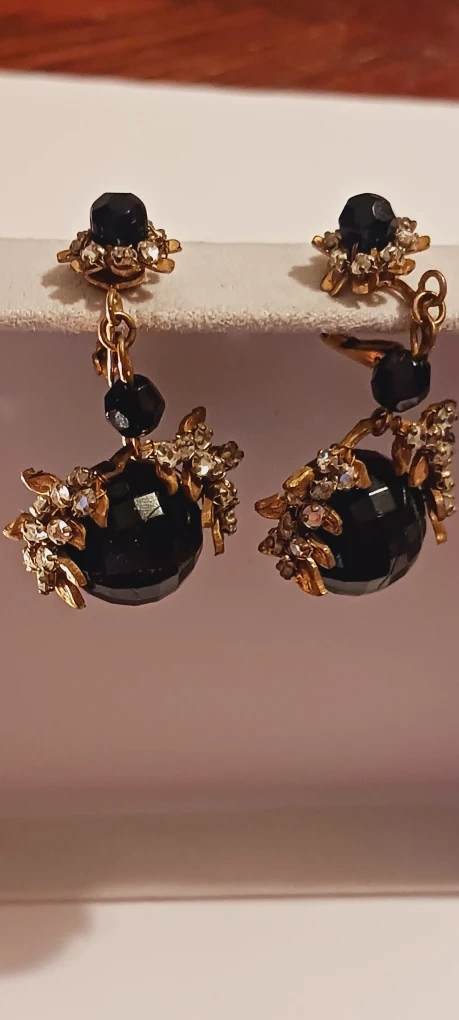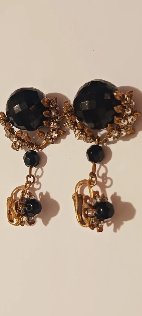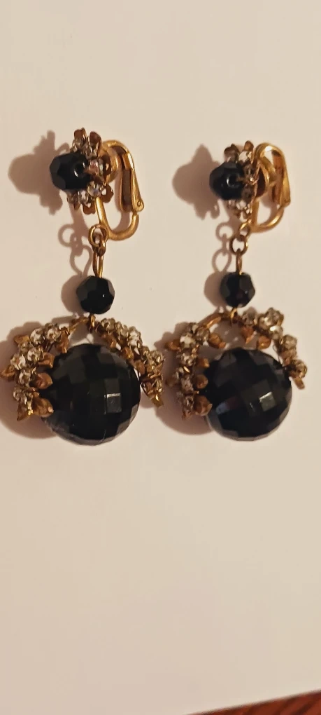 1000+MIRIAM HASKELL SIGNED Old vintage dangle earrings. They feature a black faceted bead with gold-tone metal accents and clear rhinestones. They have a clip-on style closure. 2"×1".