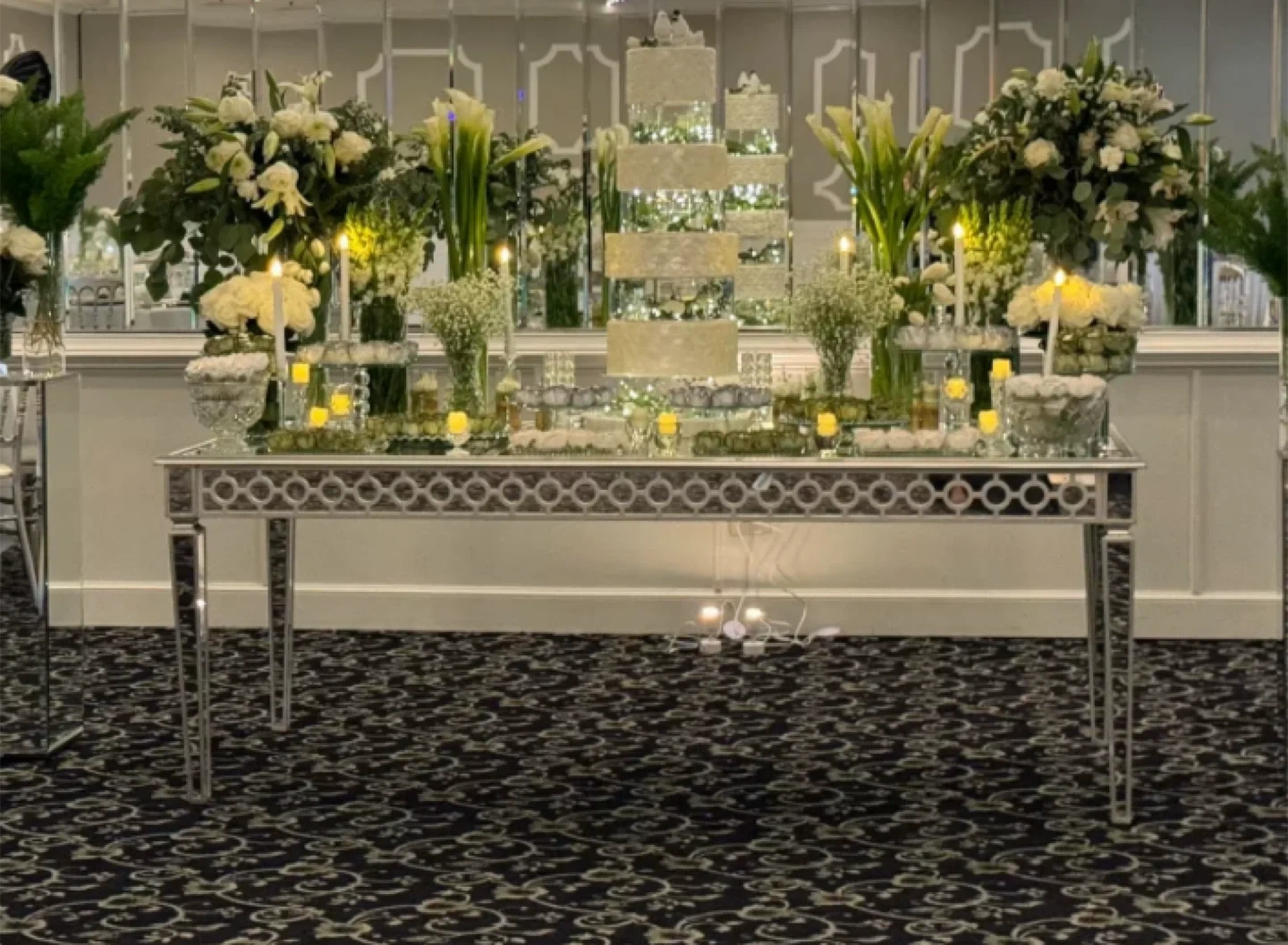 Selling a mirrored extendable dining table! It's in great condition and would be a stunning addition to any dining room. - Overall Height: 30.5" - Extended Width: 40.63" - Extended Depth: 90" - Leaf Length: 18" - Overall Product Weight: 206 lb