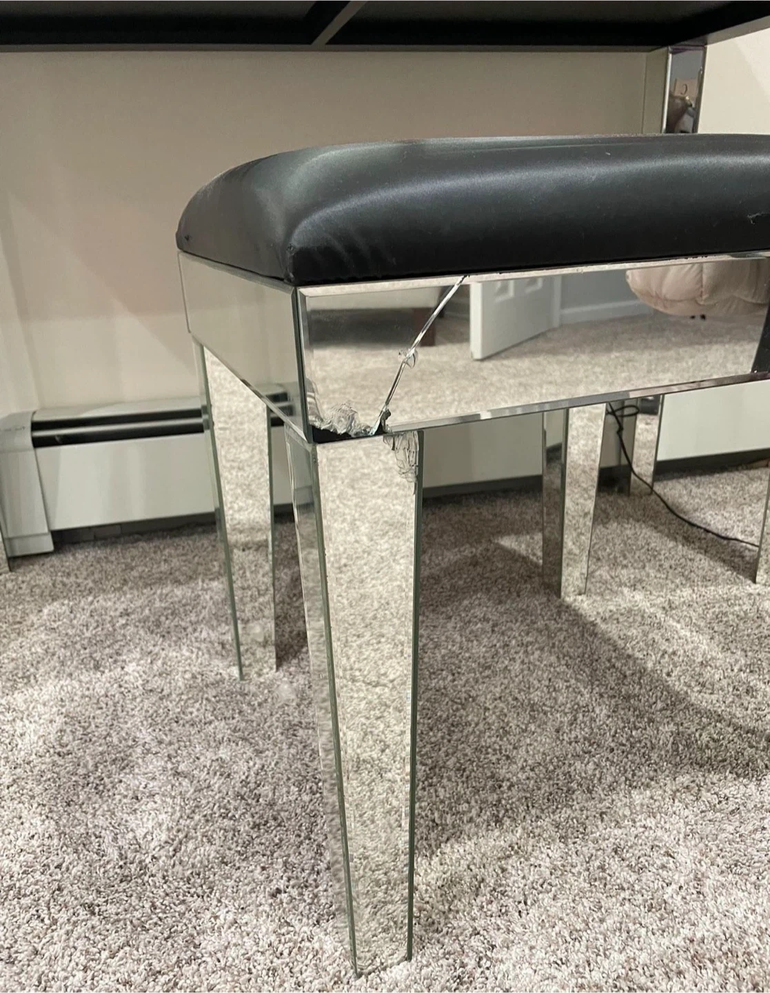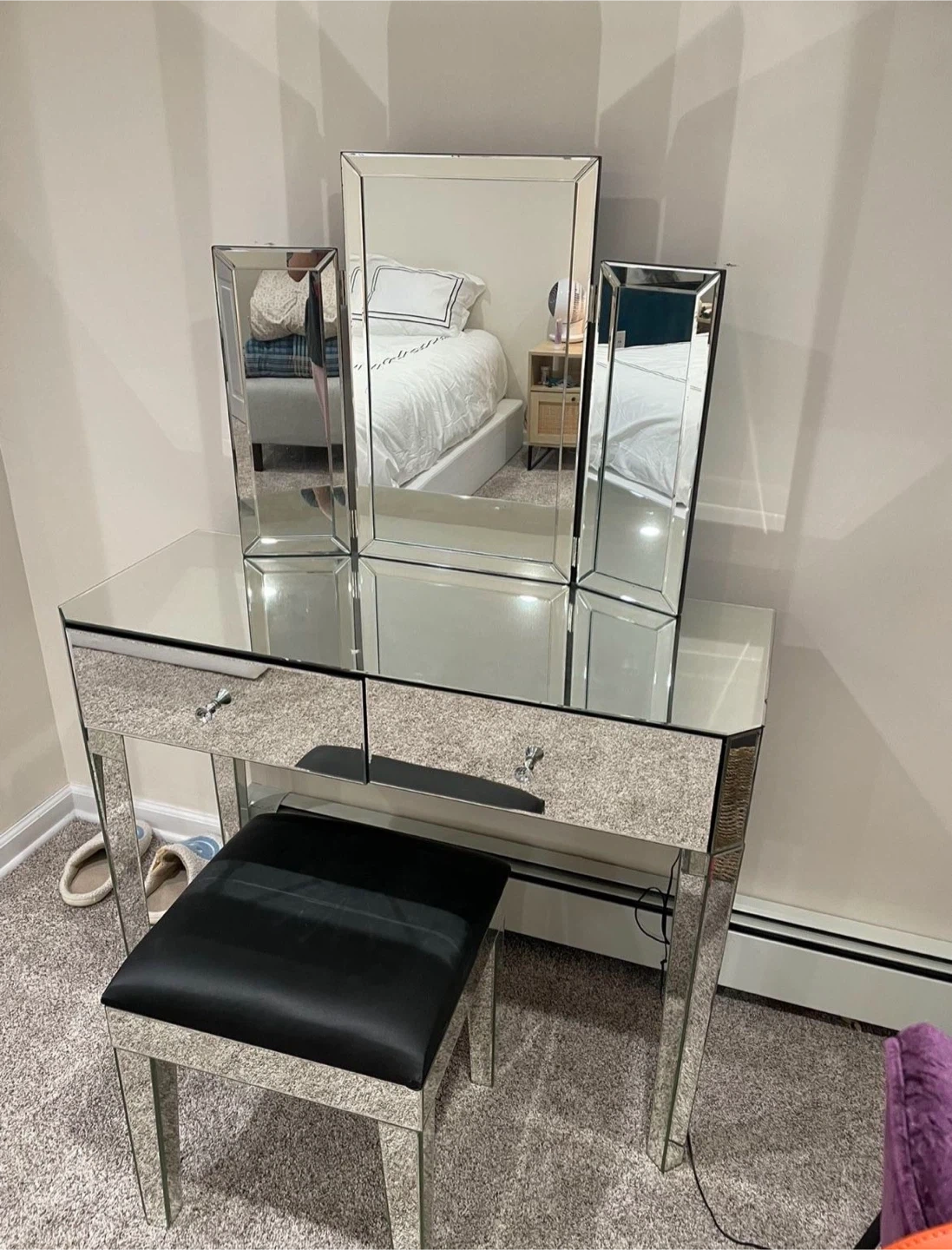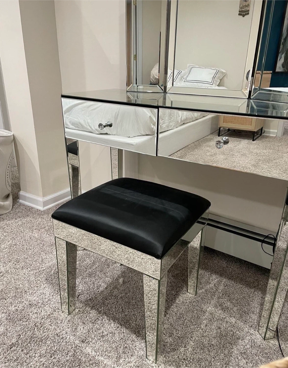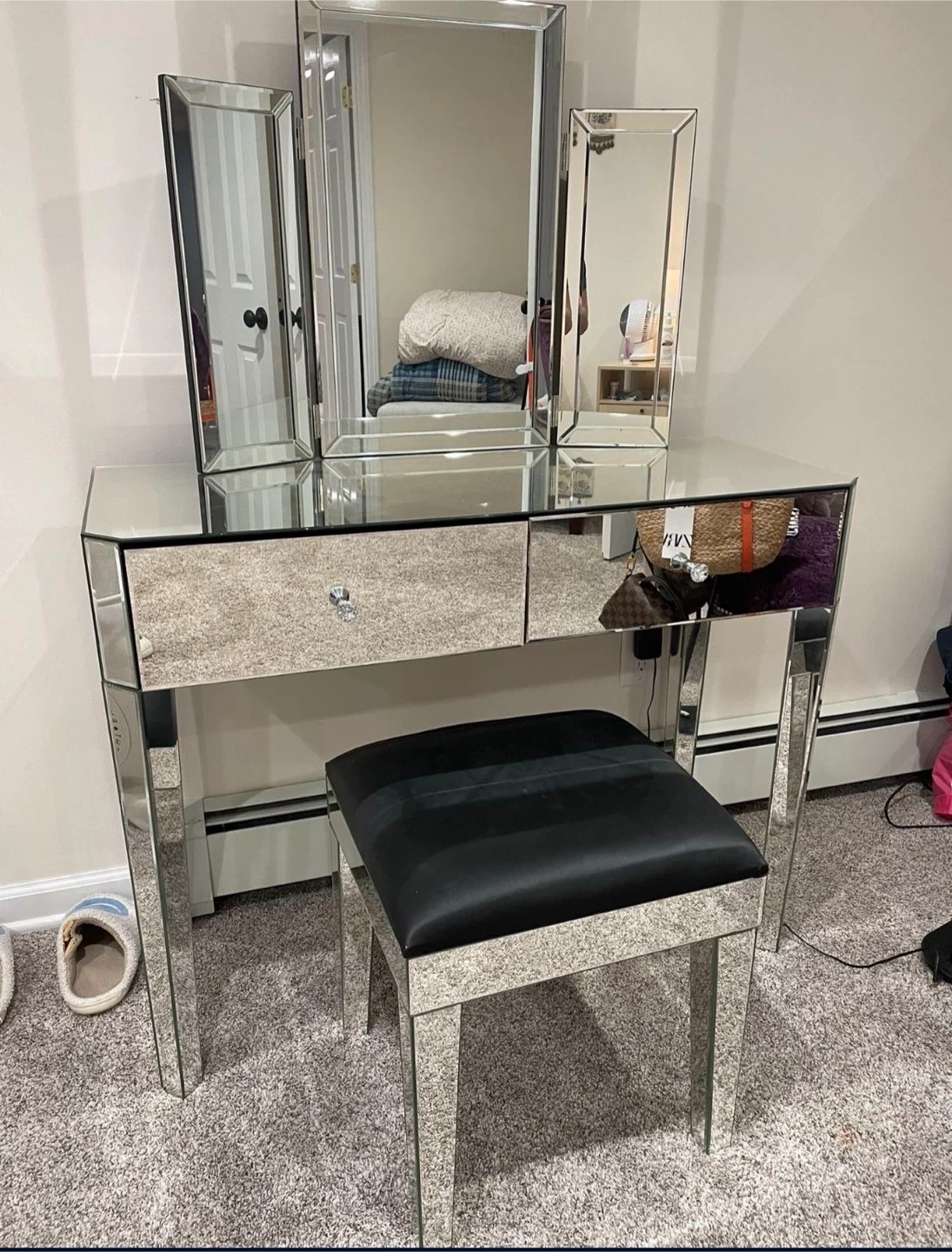 65Selling a mirrored vanity set, complete with a tri-fold mirror and stool! The vanity features drawers for storage, and the stool has a black cushioned top. There is some damage on the corner of the stool and makeup stain on inside drawer. Perfect for adding a touch of glamour to your space!