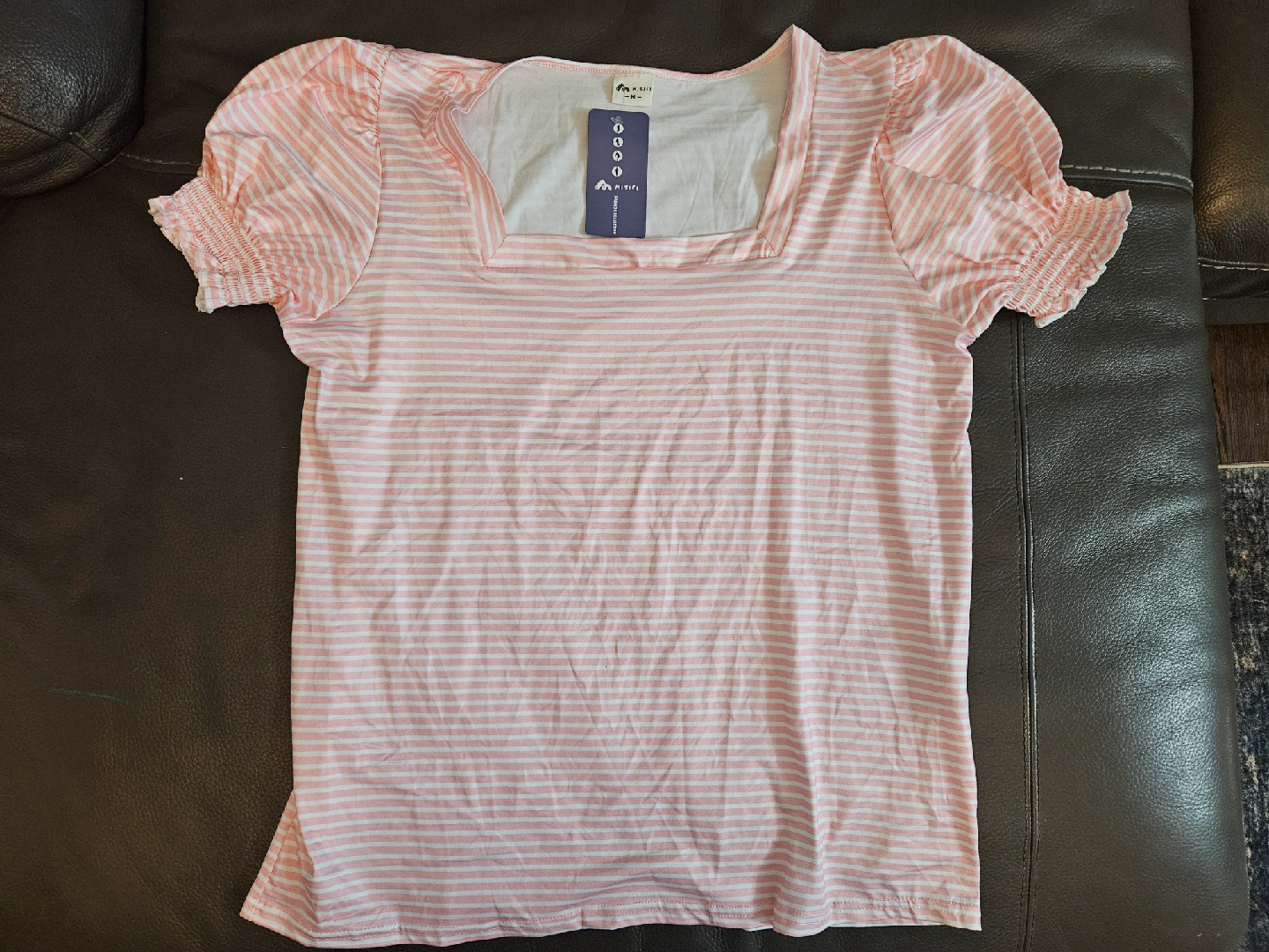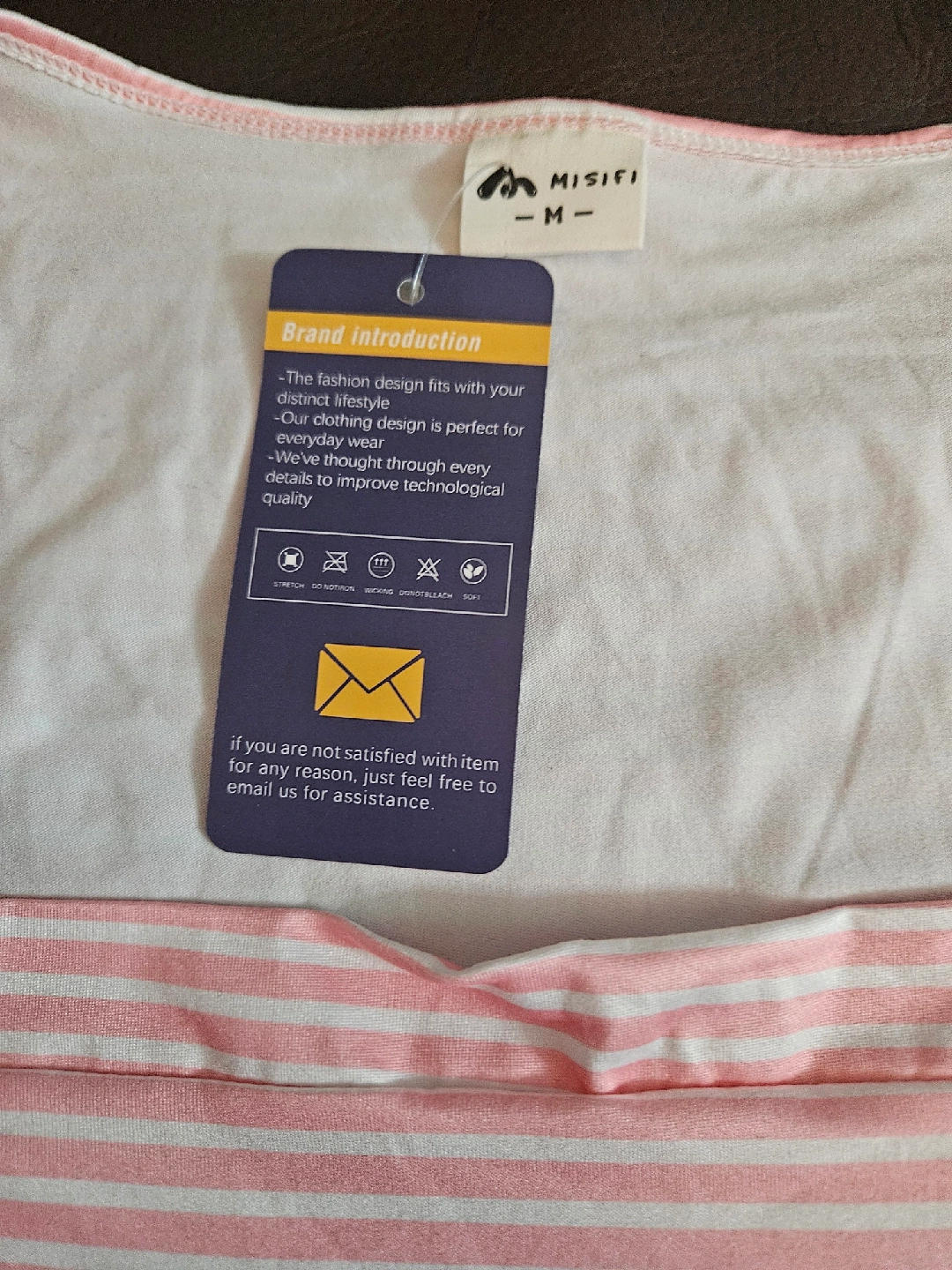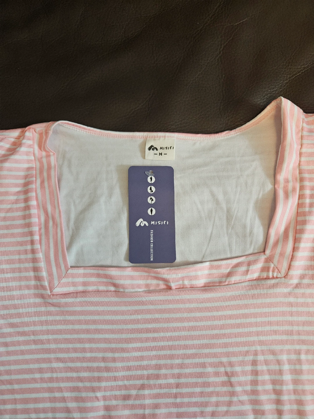 36Selling a cute MISIFI striped top with a square neckline! It's a size medium and features short, puffy sleeves. The fabric is soft and comfortable, perfect for everyday wear
