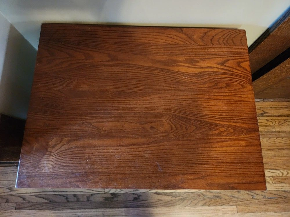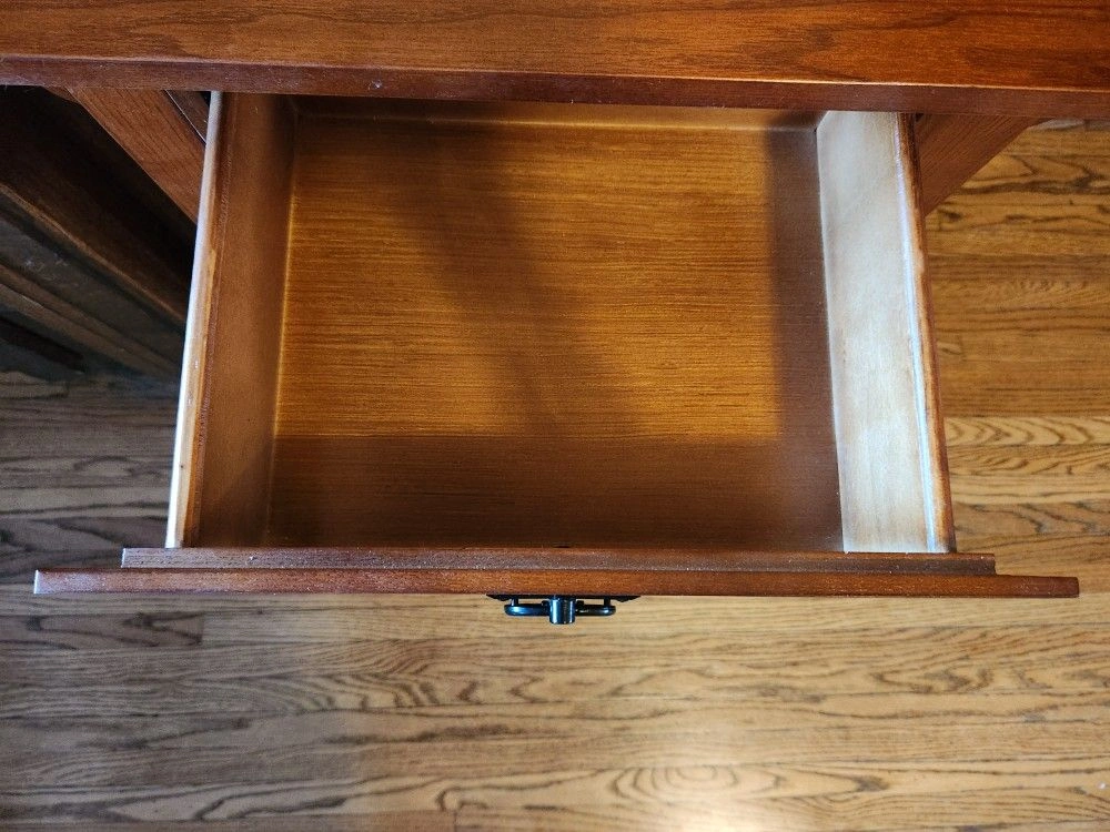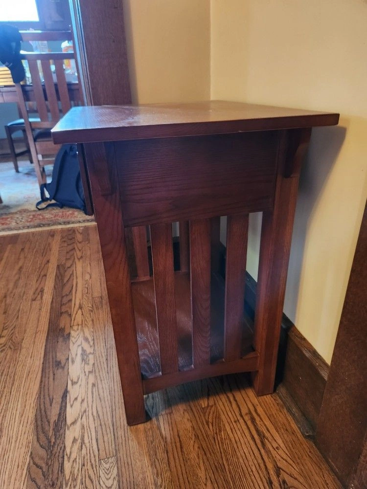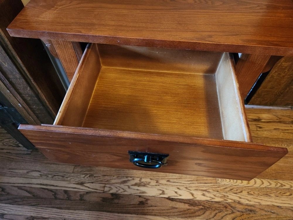 Purchased last year, we're moving and have no place for it. 24" wide x 18" deep x 28.5" tall Great condition, gently used. Drawer works well. Color: Brown Material: Wood Item Height: 25-29 in Item Width: 20-29 in Item Depth: 12-19 in