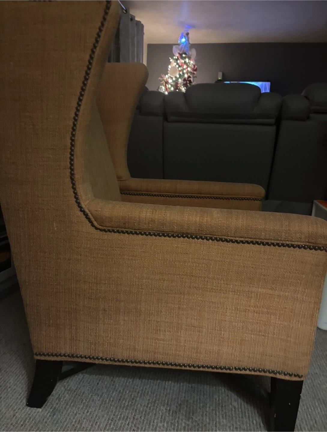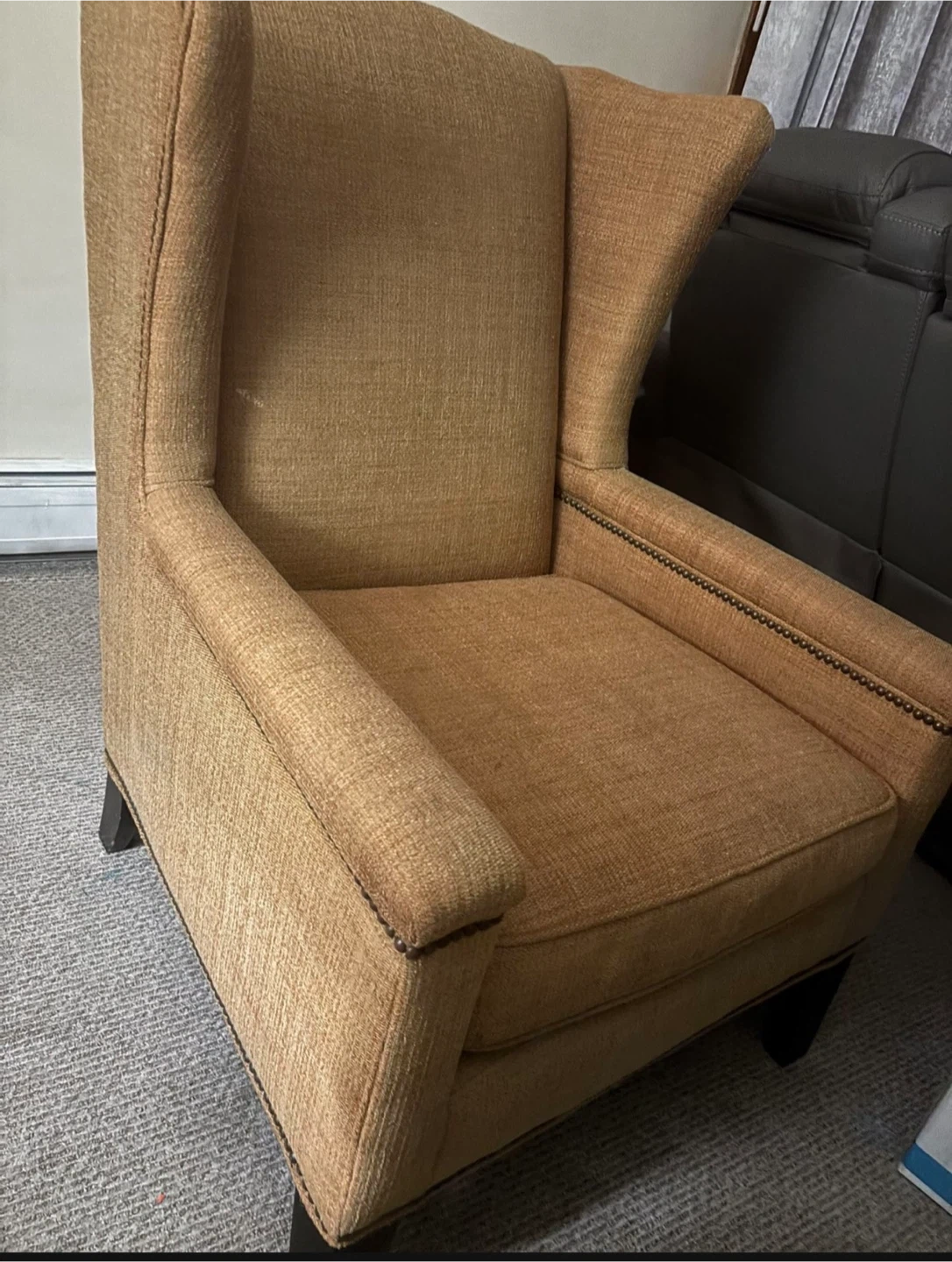 15Selling a comfortable wingback chair by Mitchell Gold. It's a stylish addition to any living room or reading nook. The chair features a classic design with nailhead trim and a sturdy frame. The color is a warm, neutral tone that complements various decor styles.