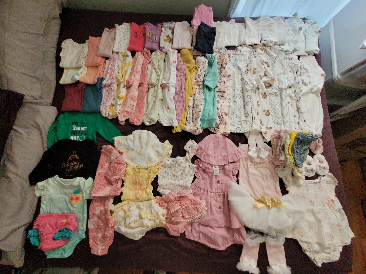 65A mixed bundle of baby clothes in various colors and styles. Includes onesies, shirts, dresses, and accessories. Perfect for a growing baby!