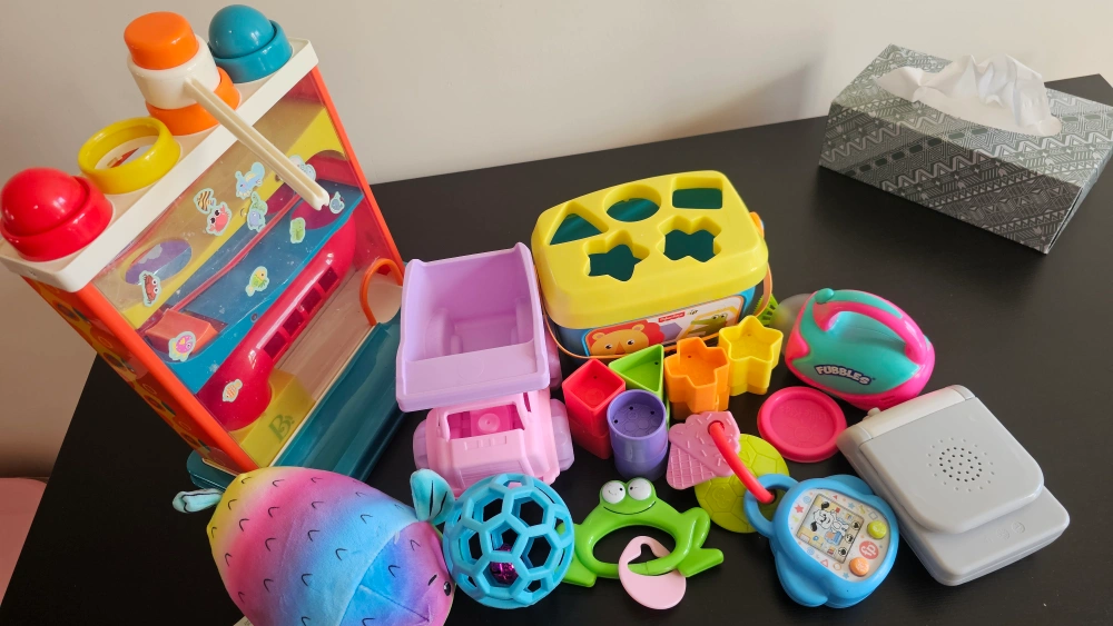 A collection of baby toys, including a Fisher-Price shape sorter with colorful shapes! There's also a variety of other toys in different colors and shapes.
