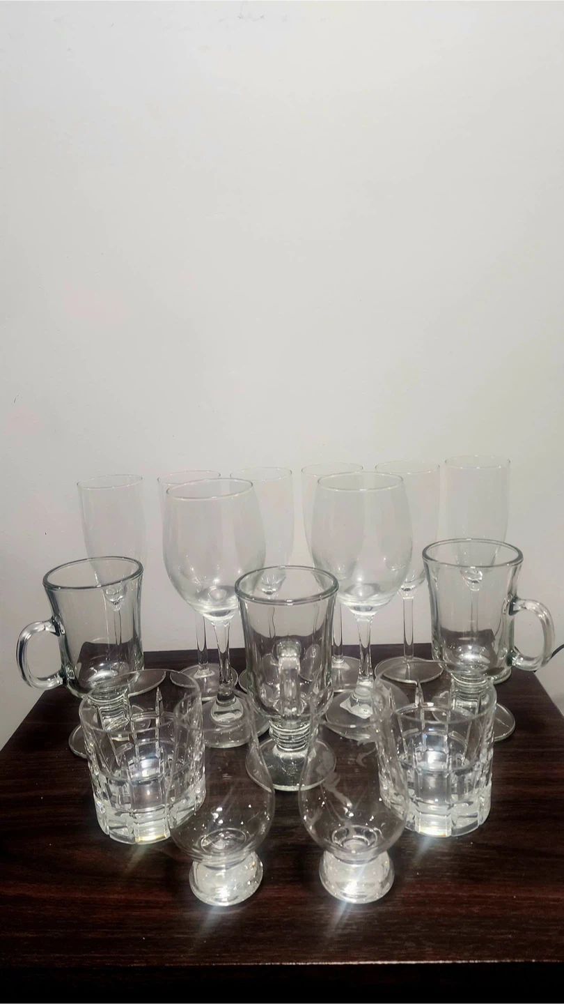 Selling a collection of various glassware pieces! Includes wine glasses, mugs, and decorative glasses. Perfect for stocking up your kitchen or adding some variety to your glassware collection