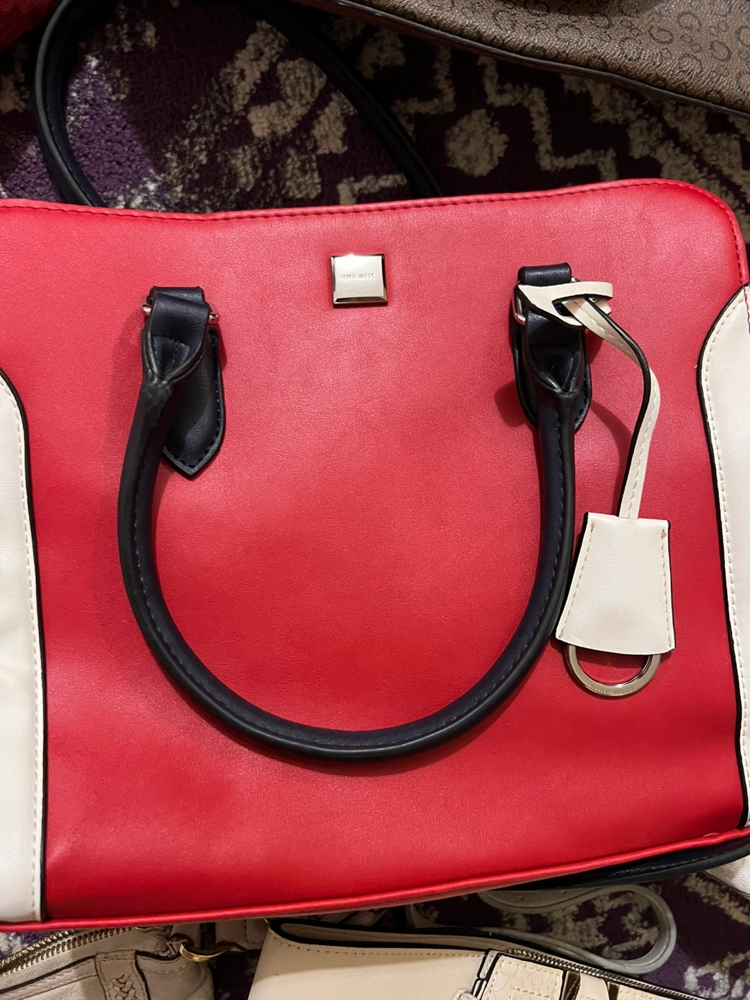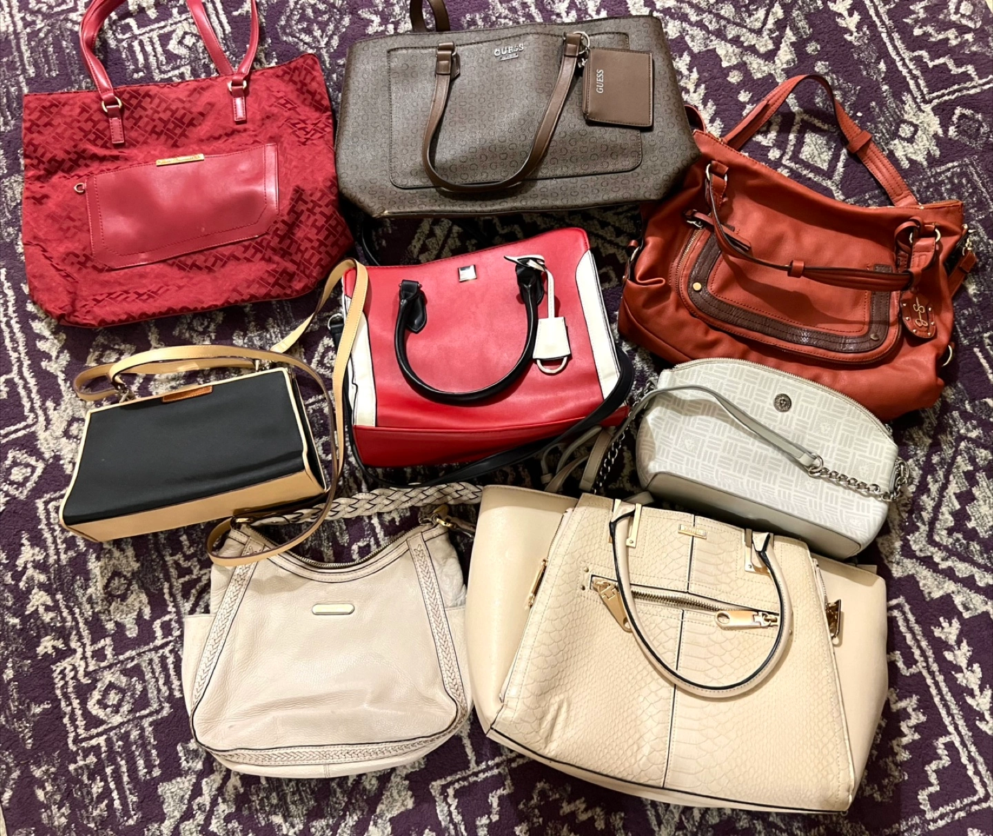 Selling a mixed lot of used handbags featuring brands like Guess, Tommy Hilfiger, and Michael Kors - Guess handbag in brown with logo pattern - Tommy Hilfiger tote bag in red - Michael Kors handbag in off-white