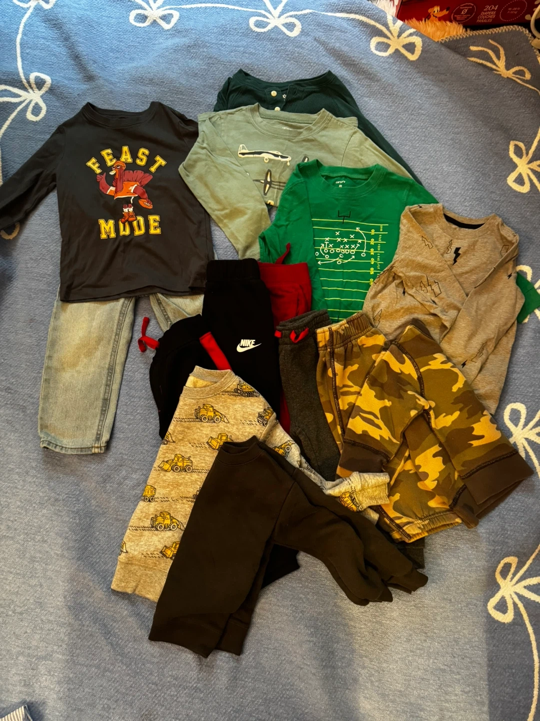 65Perfect for stocking up your little one's wardrobe. 2 sweatshirts 5 long-sleeve graphic Tshirts 1 pair light blue Old Navy straight-leg jeans 5 pairs sweatpants (Nike, CK, GAP, Mickey Mouse) 1-sweatpants and sweat shirt 2-piece (army fatigues)