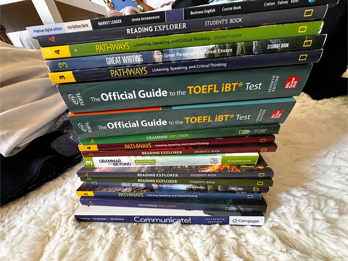 Selling a mixed lot of English textbooks, including titles like Market Leader, Reading Explorer, Pathways, Great Writing, The Official Guide to the TOEFL iBT Test, Grammar Explorer, and Communicate! Perfect for students or teachers looking for a variety of resources each 10$