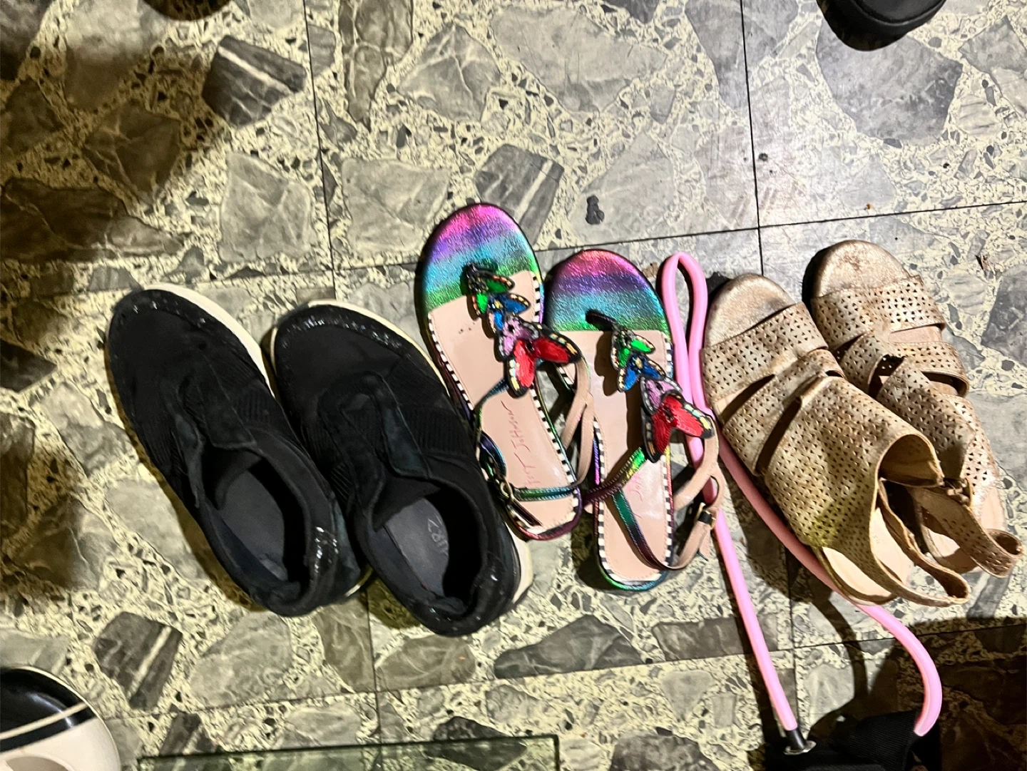 30Selling a mixed lot of women's shoes! There are three pairs, including one pair of flip-flops with butterfly decorations.