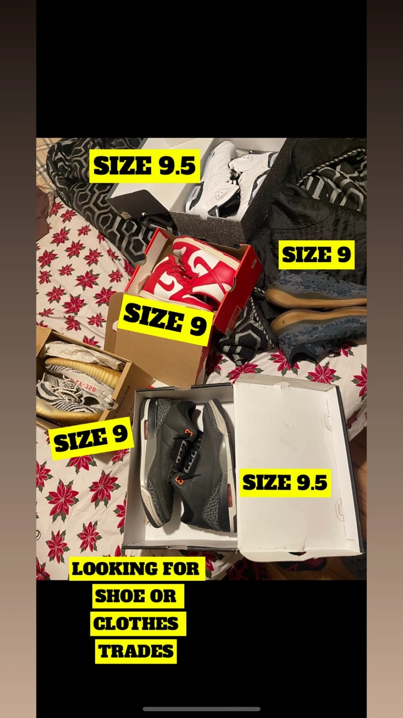Selling a collection of shoes in sizes 9 and 9.5. Includes several pairs, such as red and white sneakers, grey and black sneakers, and Adidas Yeezy sneakers. All are in used condition.