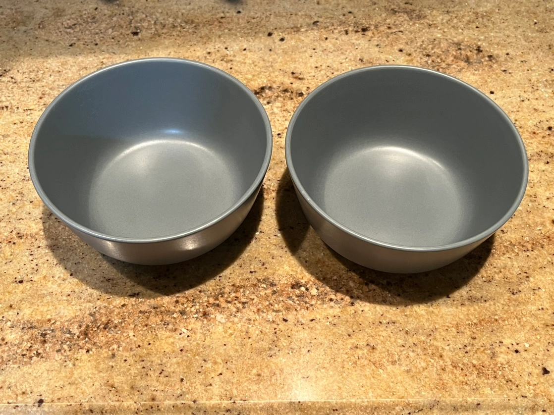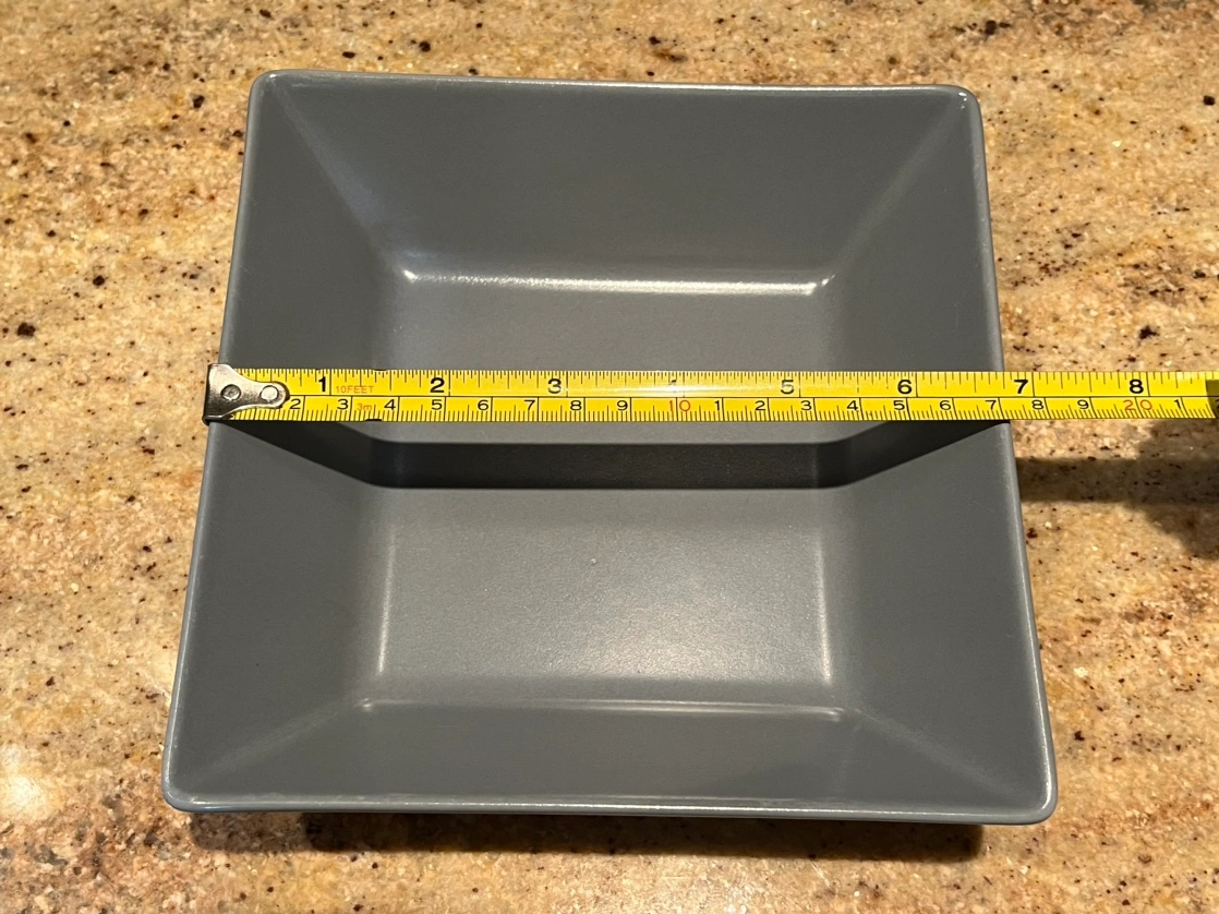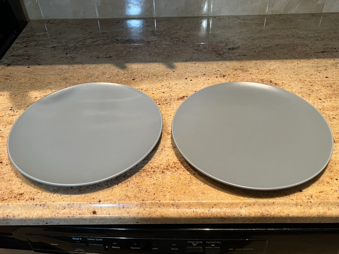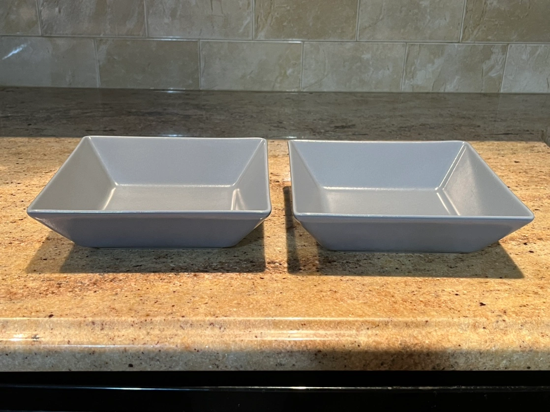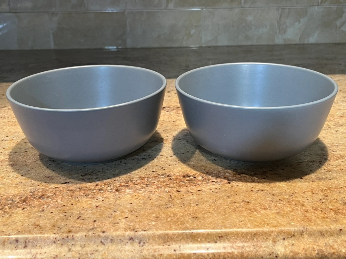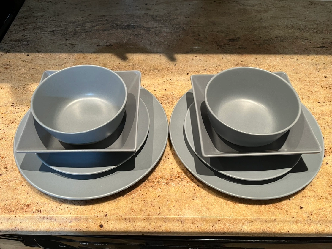 IKEA 8-piece blue gray dinnerware set for two. Includes 2 bowls, 2 square salad bowls, 2 small plates, and 2 large plates. Dishwasher and microwave safe. Cash and pickup only.