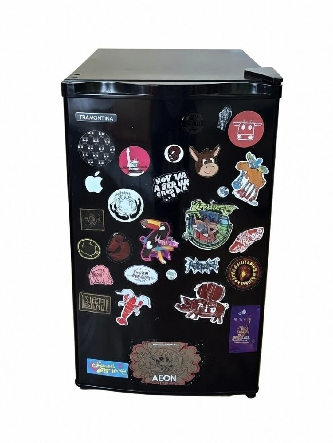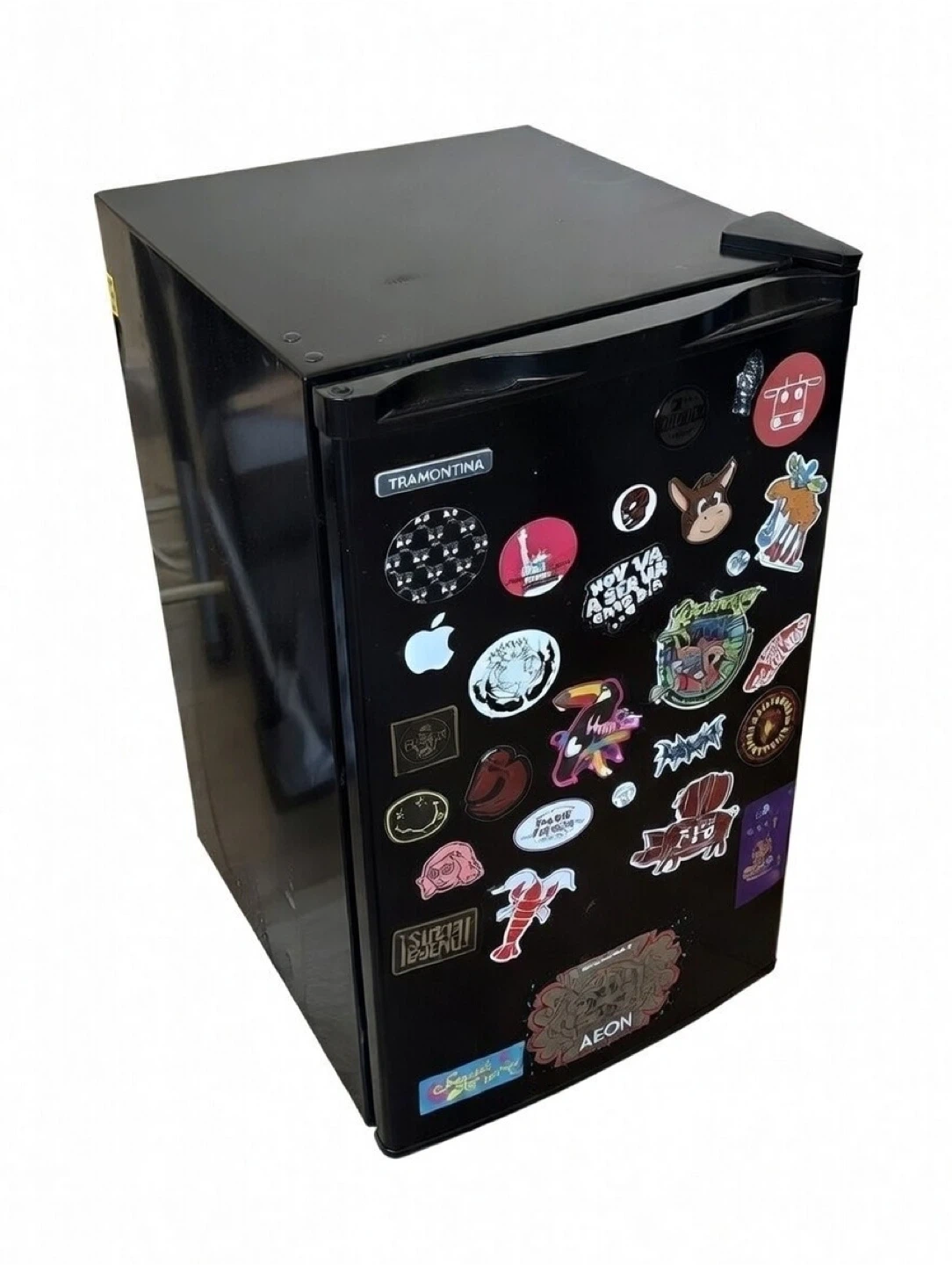 This is a black mini fridge decorated with various stickers. It's a compact appliance perfect for small spaces. The exterior is black and features numerous colorful decals.