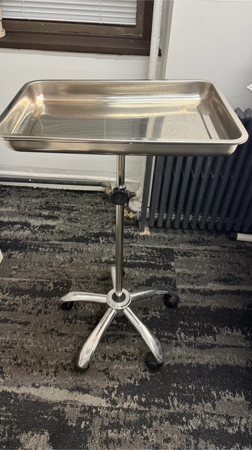 Selling a stainless steel medical instrument tray on a rolling stand. It's in good condition and perfect for various uses. The tray is made of durable stainless steel and the stand has a sturdy five-wheel base for easy mobility