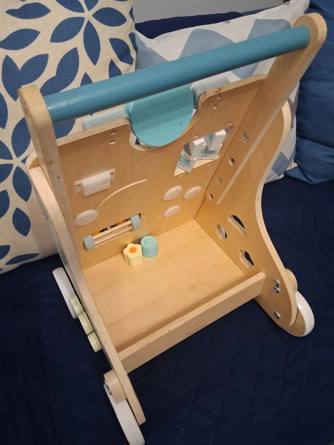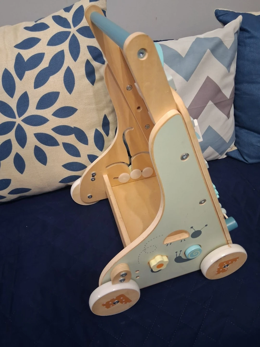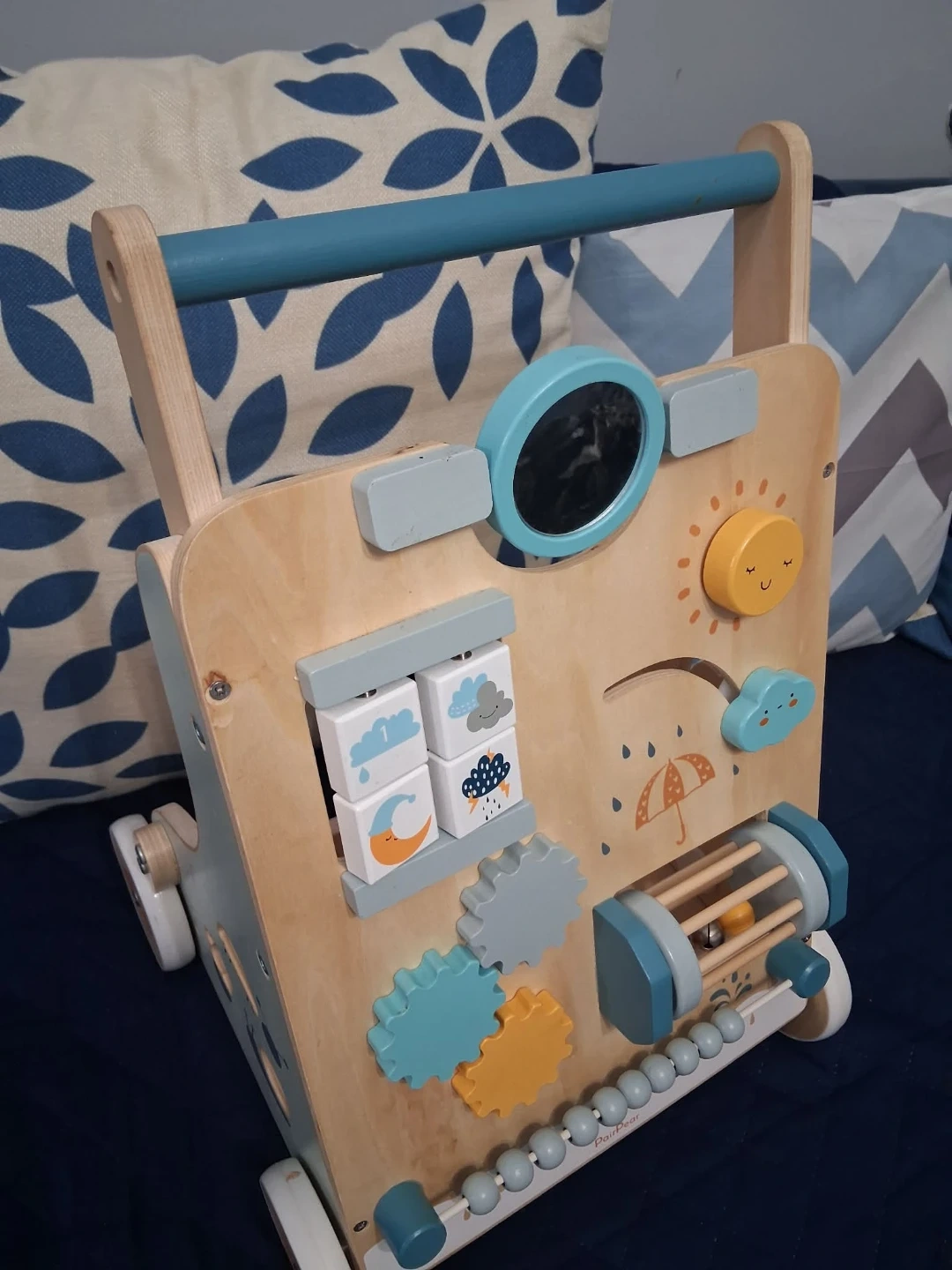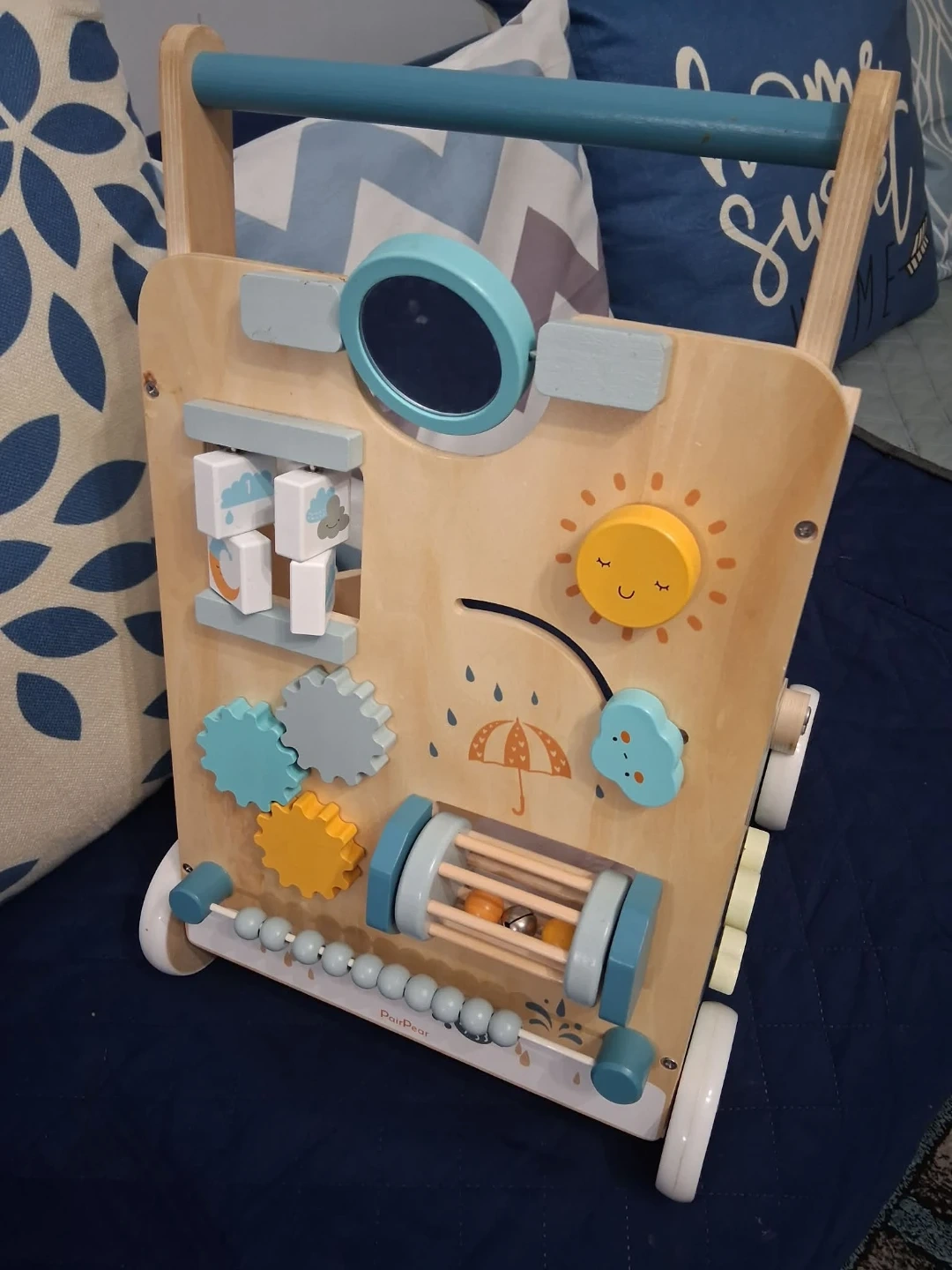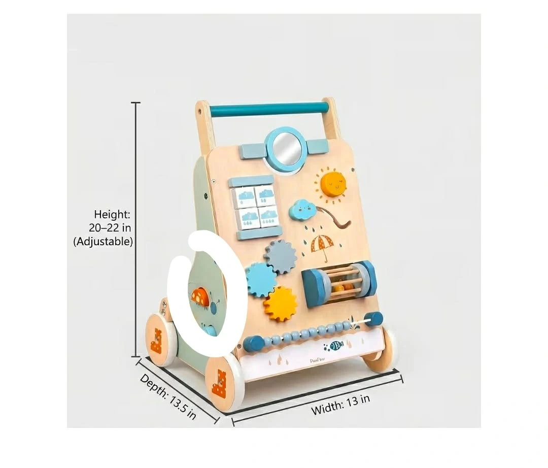 This wooden activity walker features gears, a mirror, weather blocks, and a bead roller. It's designed to help toddlers develop motor skills and coordination. Height is adjustable from 20-22 inches, width is 13 inches, and depth is 13.5 inches.