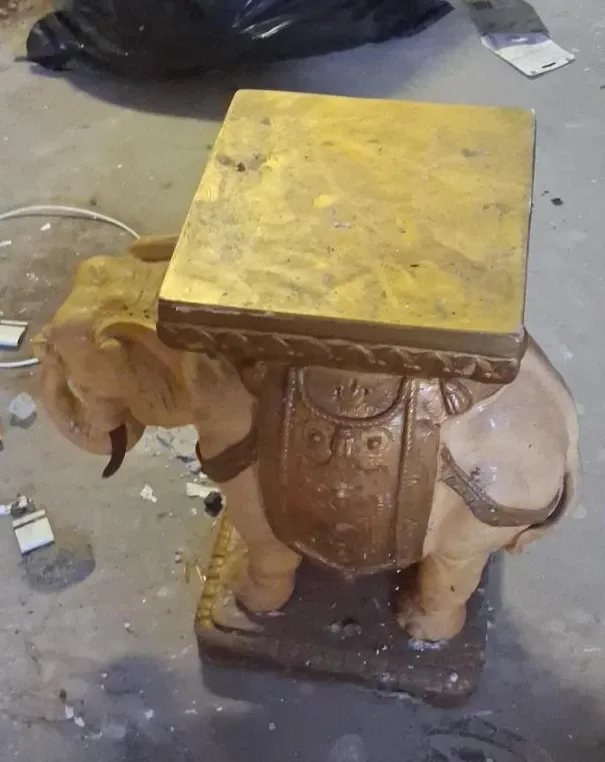 This is an elephant pedestal stand, likely made of resin or a similar material. It features an elephant figure supporting a square top surface, with decorative saddle details. It's a charming decorative piece.
