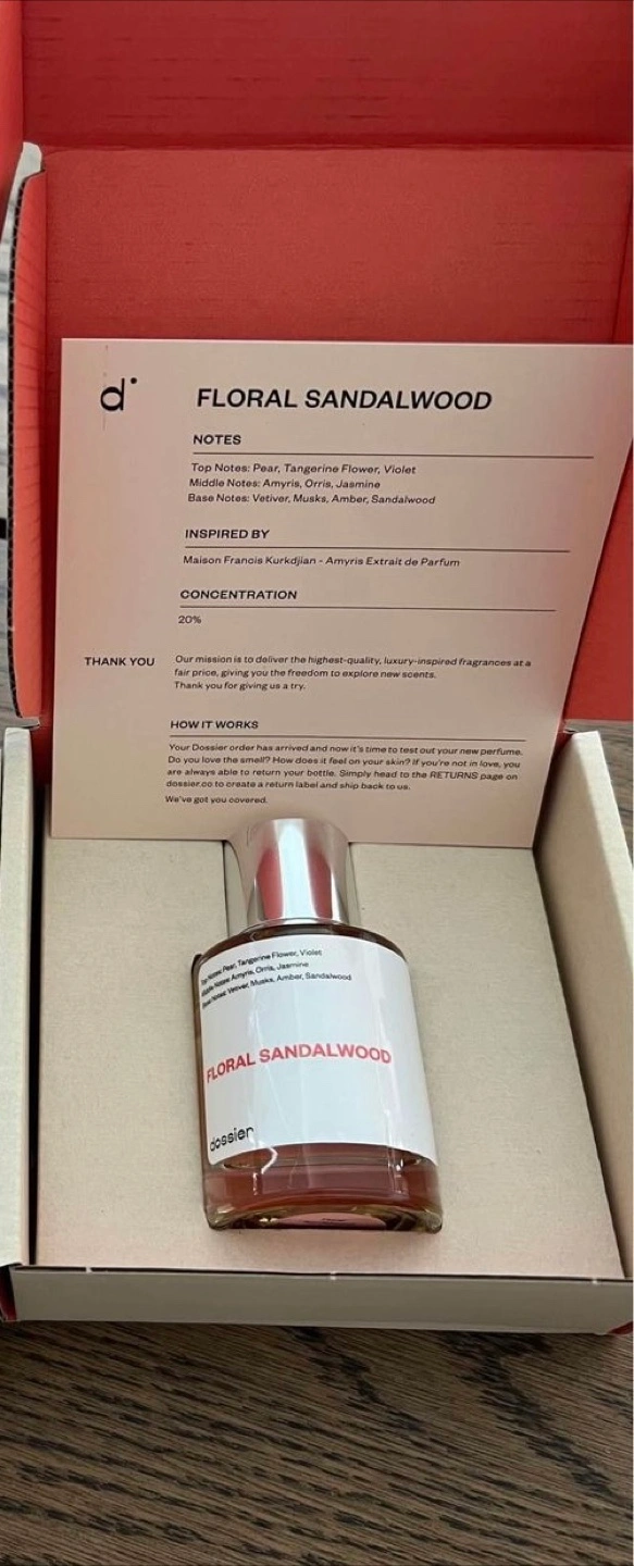 New, unopened Dossier Floral Sandalwood perfume. Inspired by Maison Francis Kurkdjian - Amyris Extrait de Parfum. 20% concentration. Top notes: pear, tangerine flower, violet. Middle notes: amyris, orris, jasmine. Base notes: vetiver, musks, amber, sandalwood.