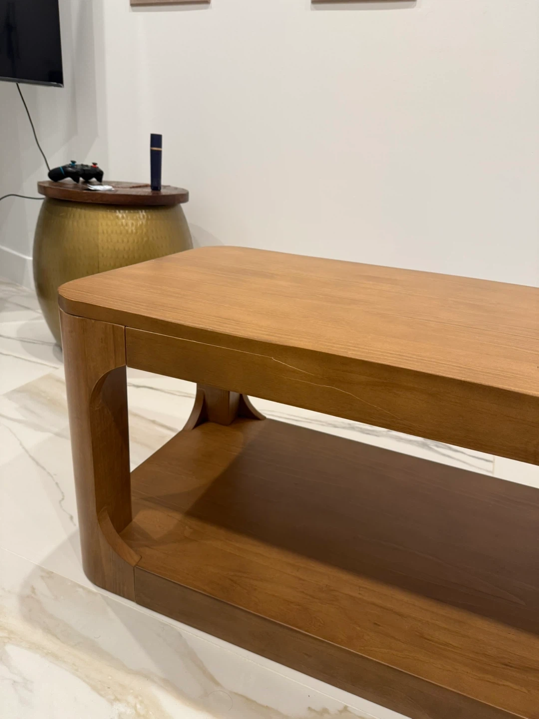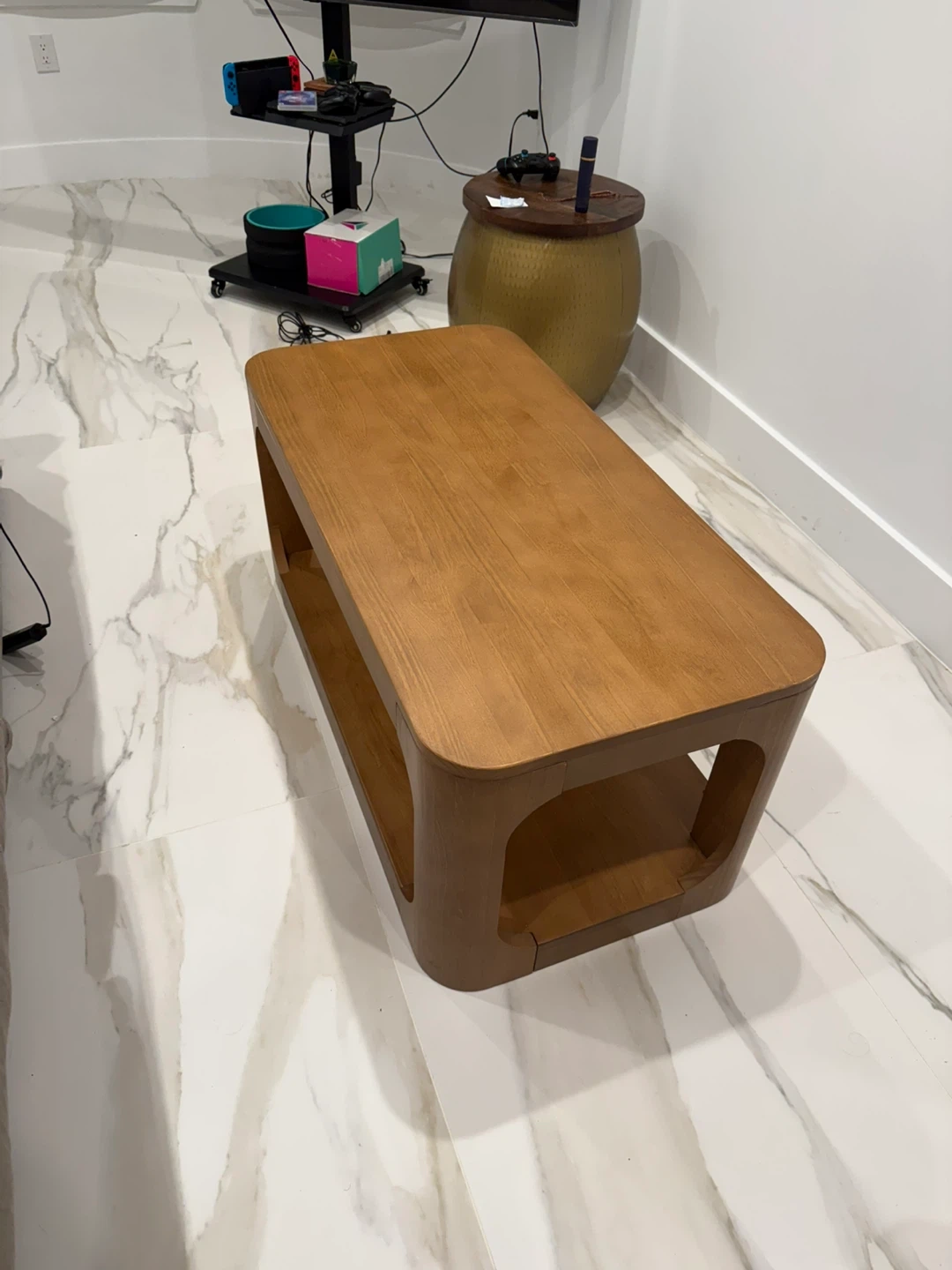 Solid wood coffee table with a natural finish. It features a lower shelf for extra storage. Modern rounded design.