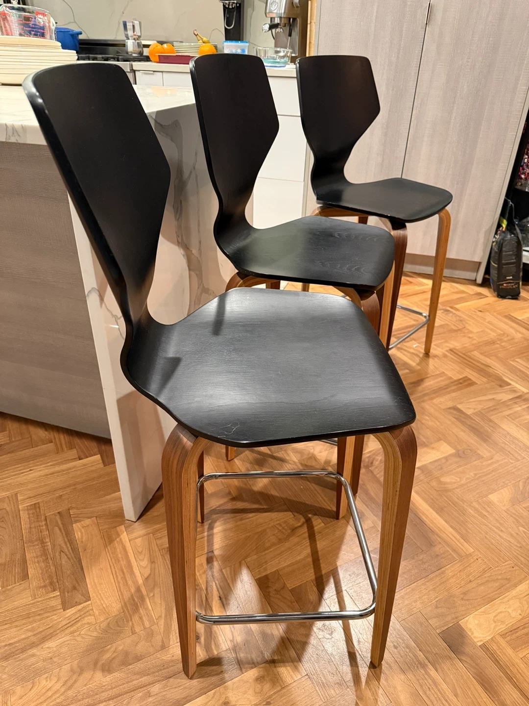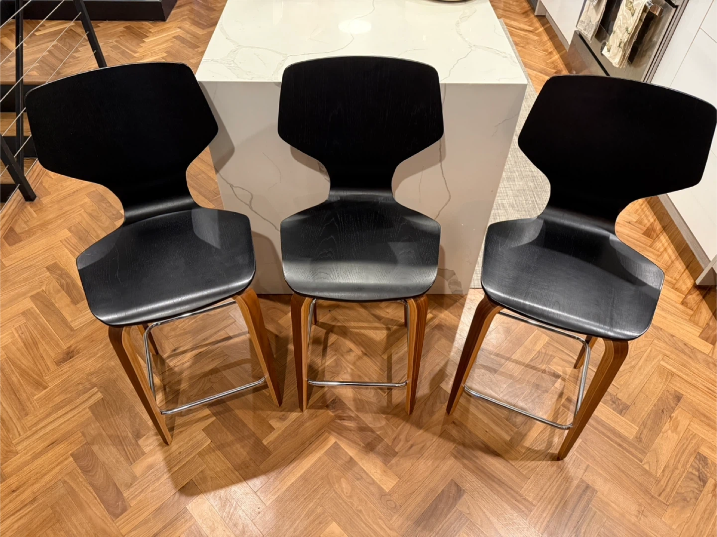 These Room & Board bar stools are in great condition and would look great in any kitchen or bar area! The black wood finish is sleek and stylish, and the sturdy construction ensures they will last for years to come. These are R&B Pike barstools original price was $299 per stool. Seat height 24”. 19x20x40.