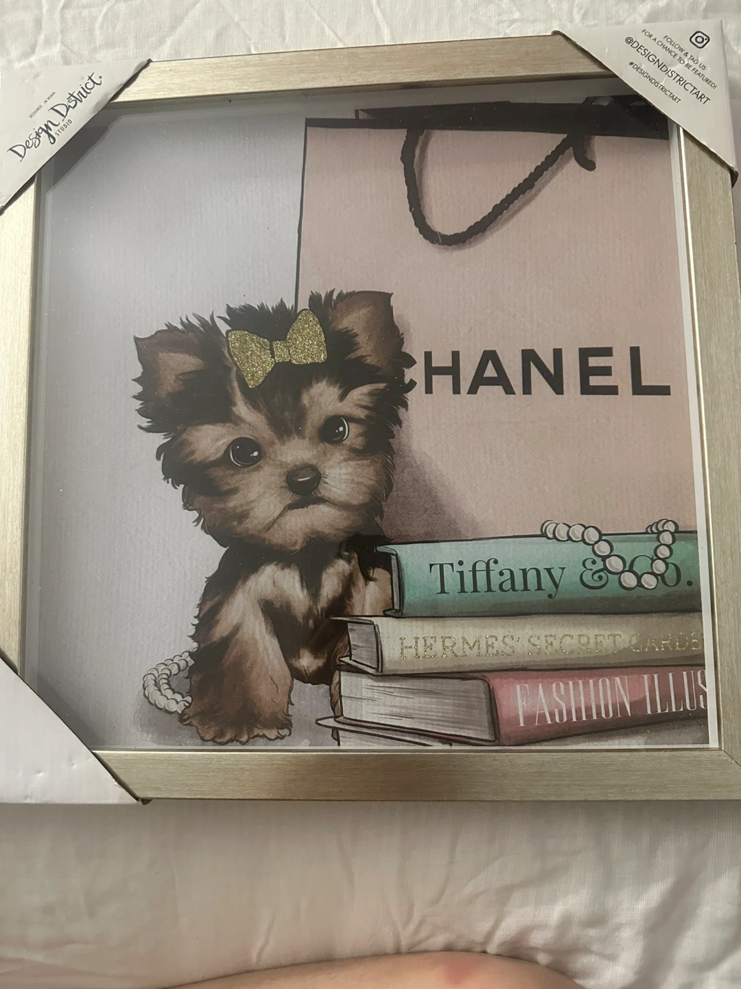 This framed art print from Design District Studio features a cute puppy in front of a Chanel bag and designer books. The artwork has a textured glitter effect on the bow. It's ready to hang and adds a touch of luxury to any room!