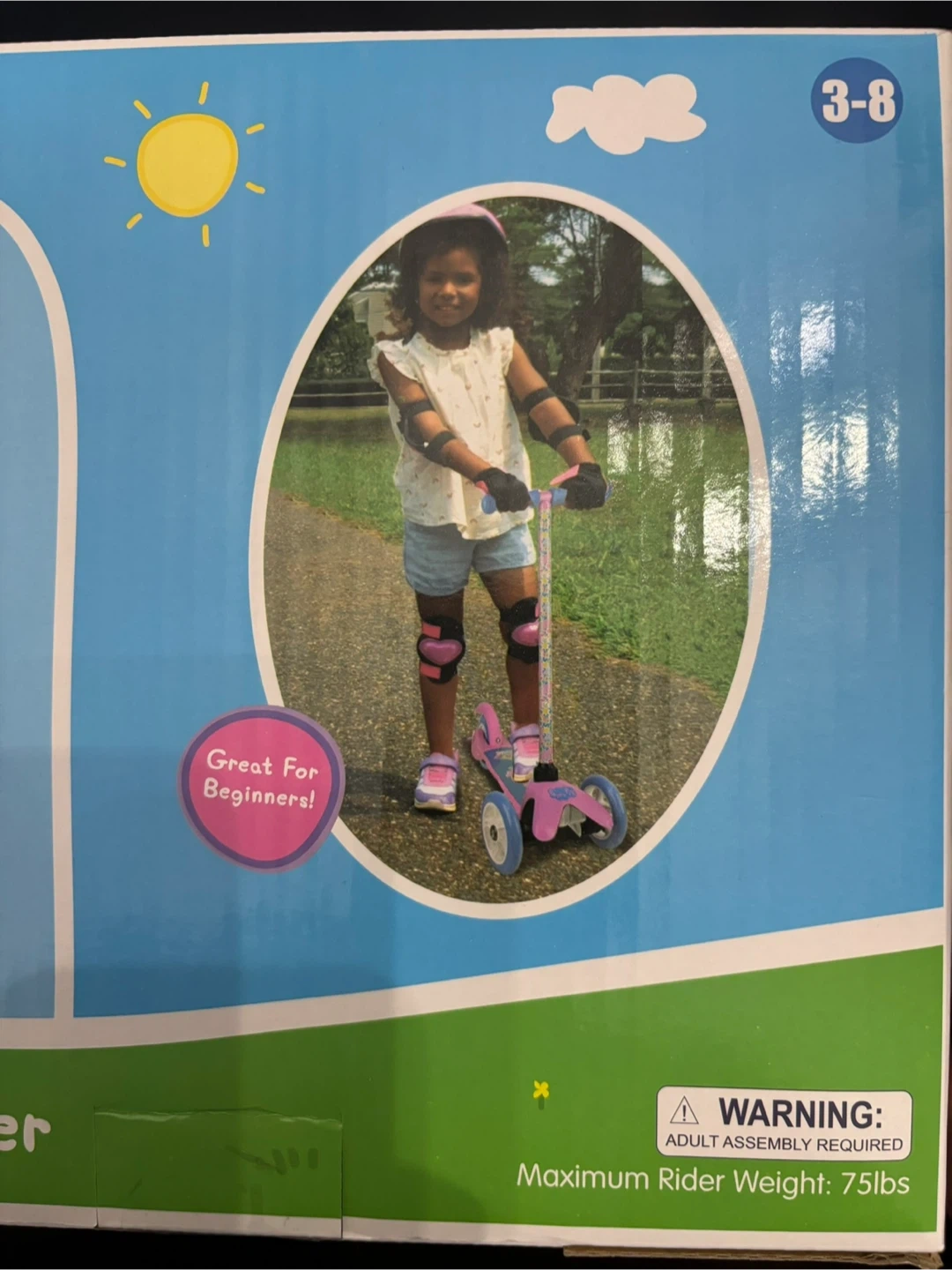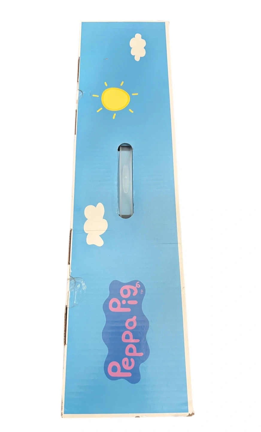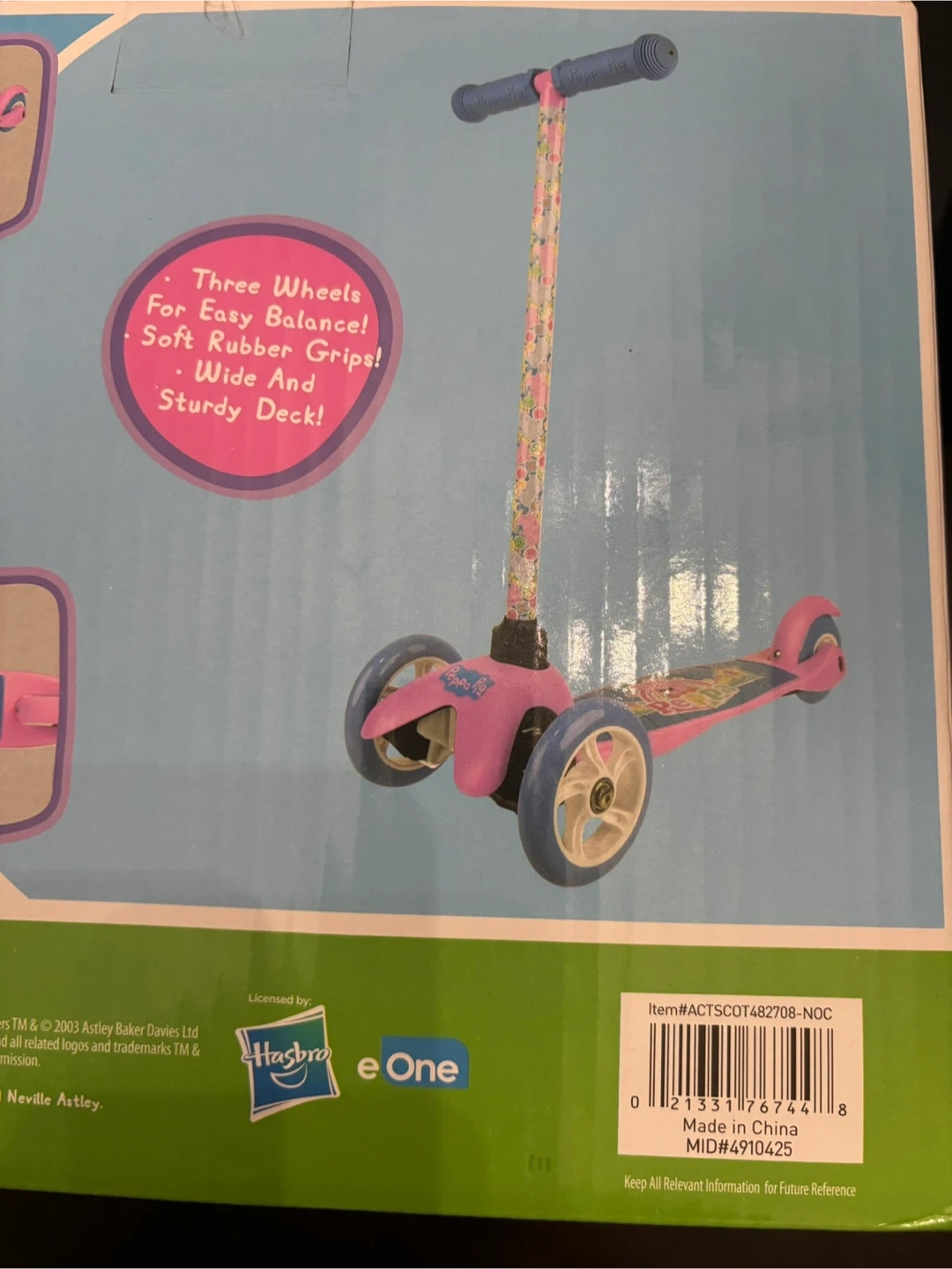 This pink Peppa Pig scooter is designed for easy tilt and turn steering. It features three wheels for stability, soft rubber grips, and a wide, sturdy deck. Suitable for ages 3-8 with a maximum rider weight of 75lbs.
