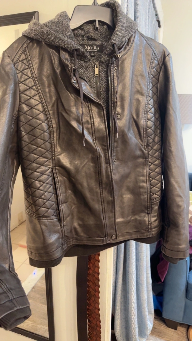 10Brown faux leather jacket with a removable grey hoodie. Has a zipper closure and diamond-shaped stitching detail.
