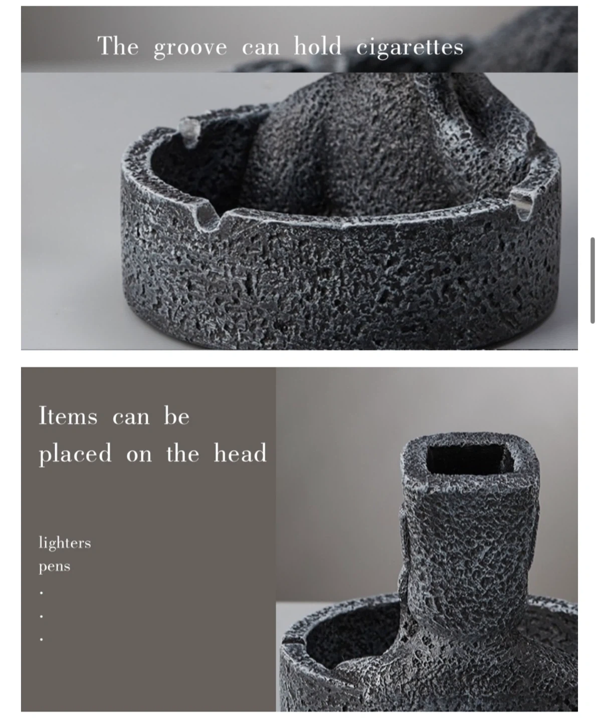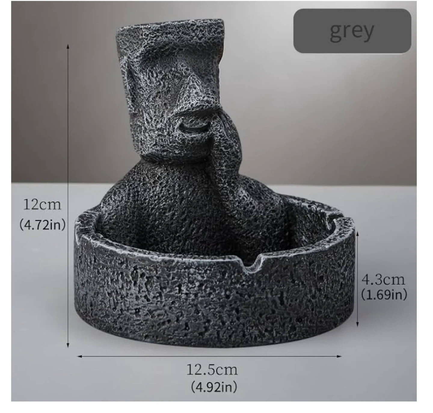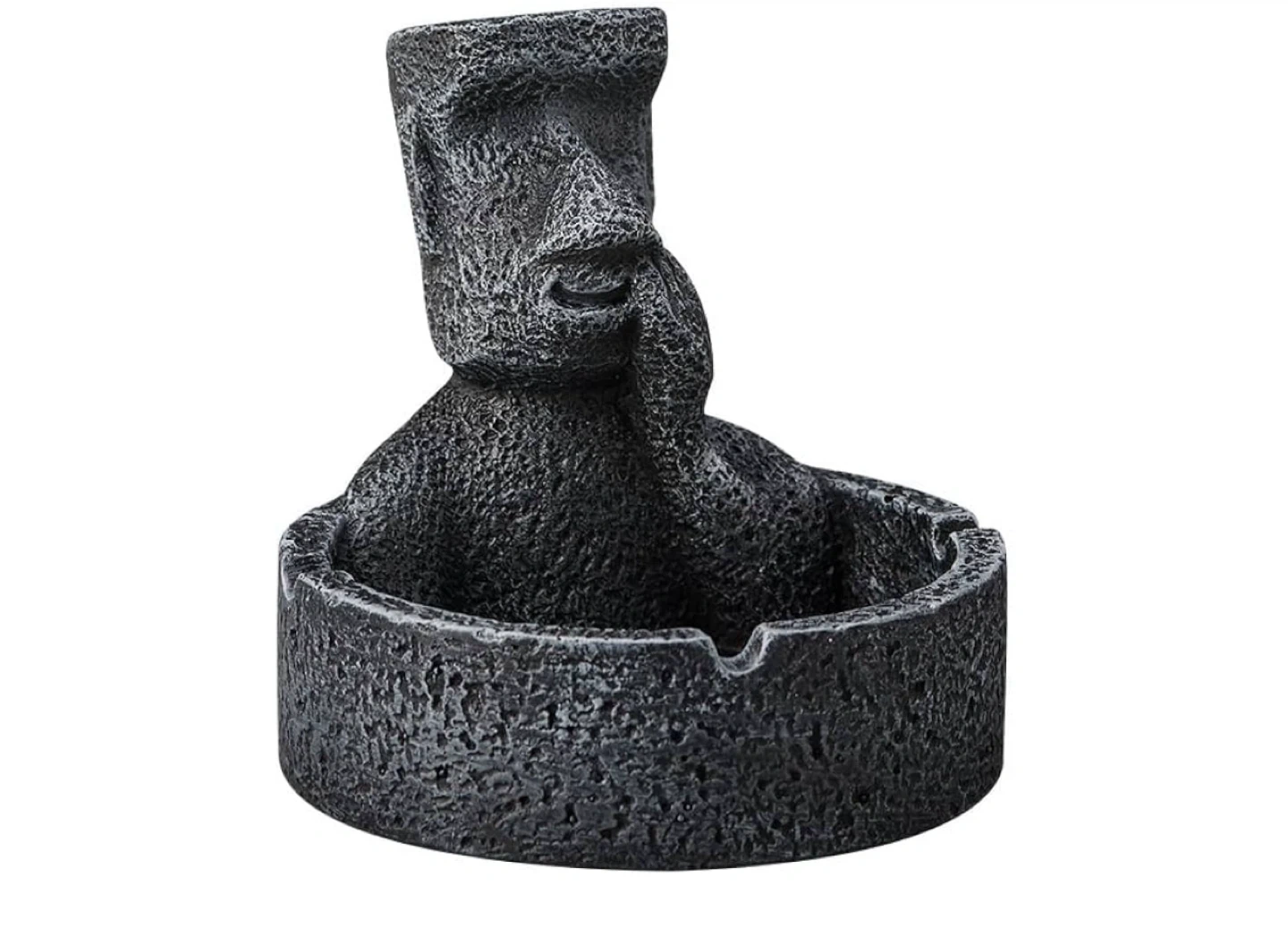 150This unique ashtray features a Moai statue design in a cool grey color! It's made to hold cigarettes with a groove, and you can even place small items on the statue's head, like lighters or pens. It measures about 4.72 inches in height and 4.92 inches in width.
