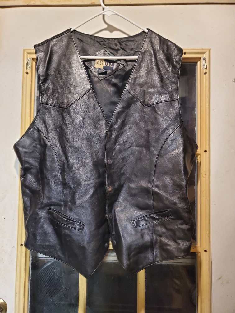Selling a gently used Modal black leather vest in size XXL. The shell is 100% genuine leather, and the lining is 100% polyester. It's a stylish piece that would look great! needs a good cleaning.