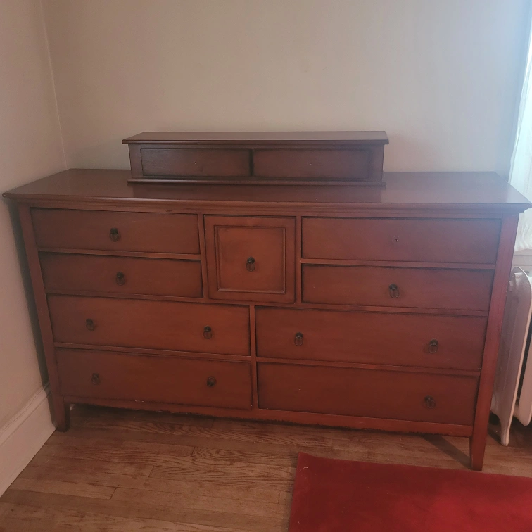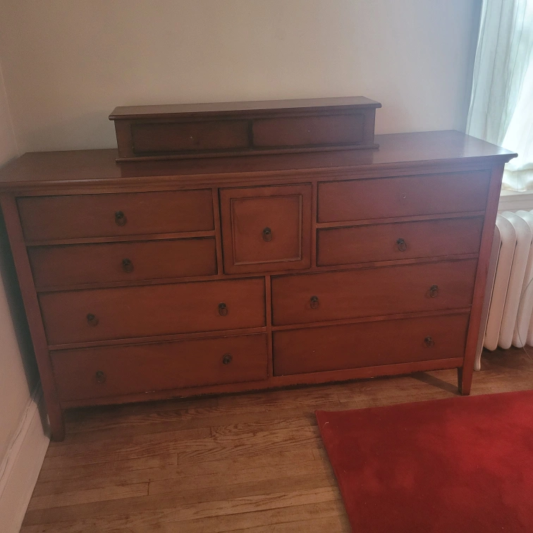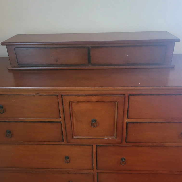 15Modern style wide Chest of Drawers or Dresser. It's a total of 11 drawers that includes the top additional 2 drawer set. That set is not attached and can be moved around. It's a medium tone of reddish brown and is quite a beautiful piece of furniture. It will need new knobs for the top piece which wouldn't necessarily need to match. @ 64 wide X 38 height without extra top piece X 28 depth.