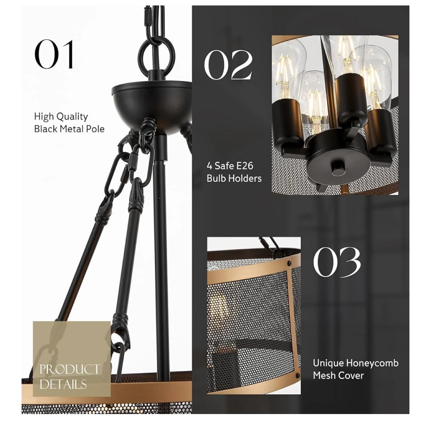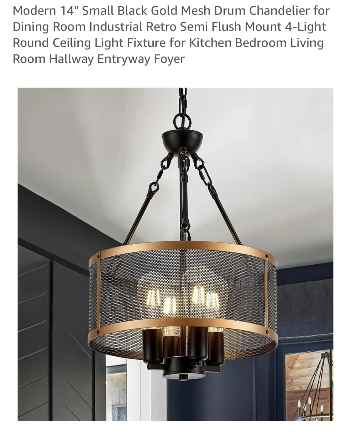 Modern 14" Small Black Gold Mesh Drum Chandelier for Dining Room Industrial Retro Semi Flush Mount 4-Light Round Ceiling Light Fixture for Kitchen Bedroom Living Room Hallway Entryway Foyer