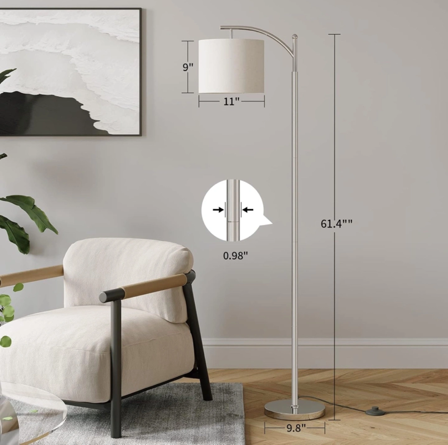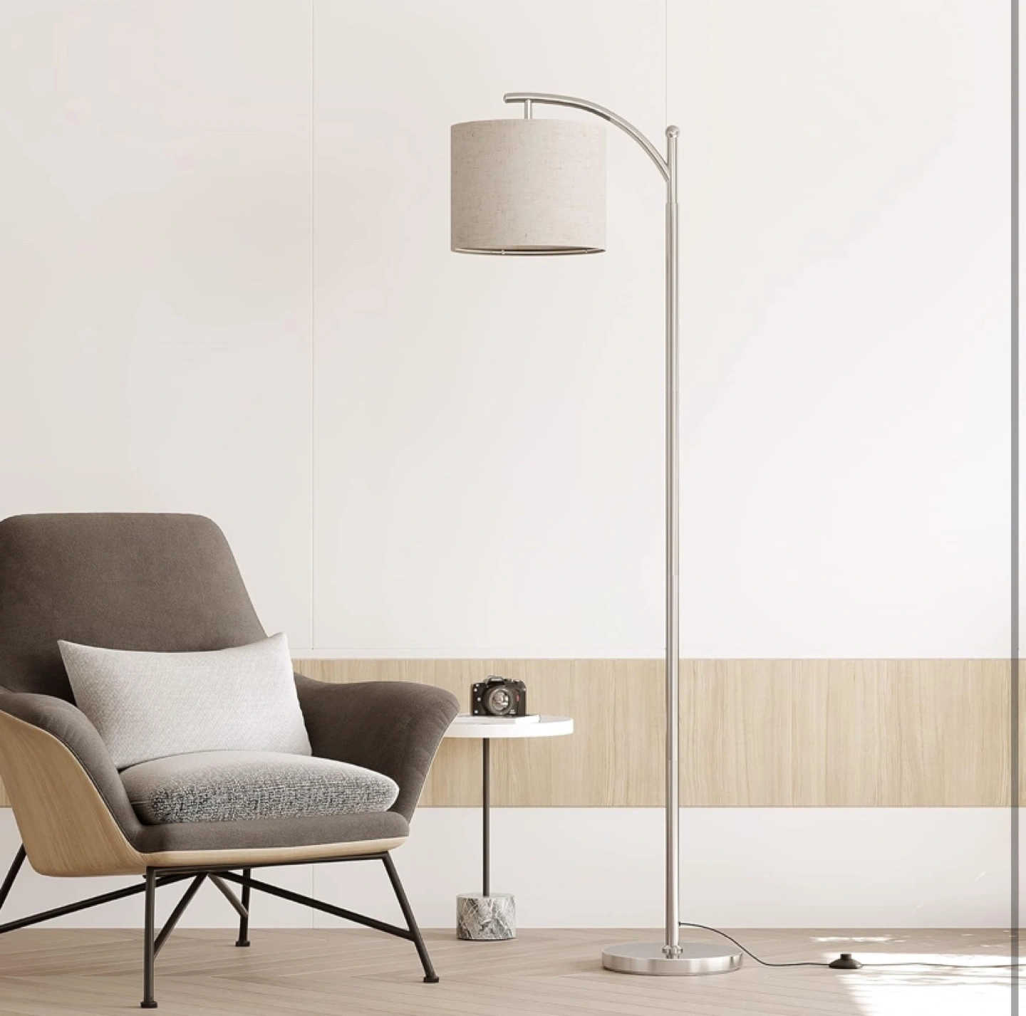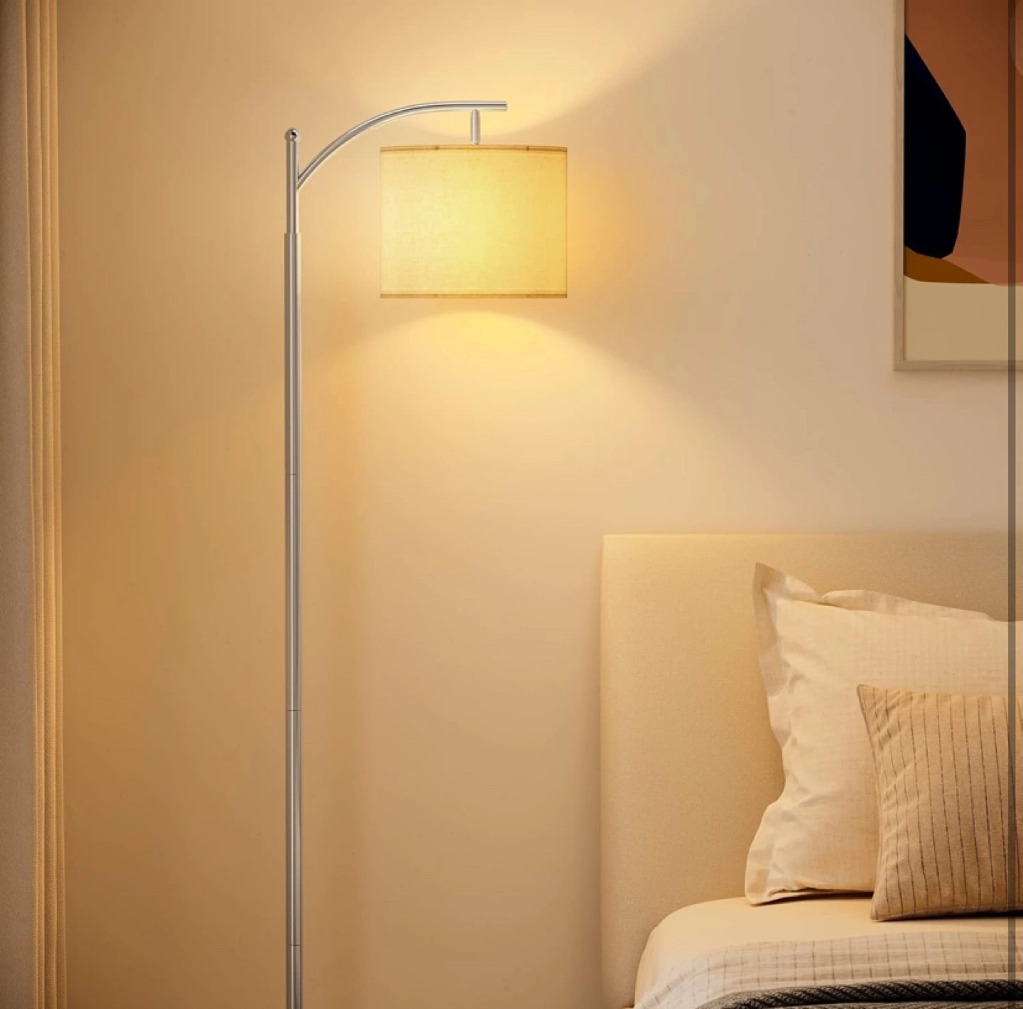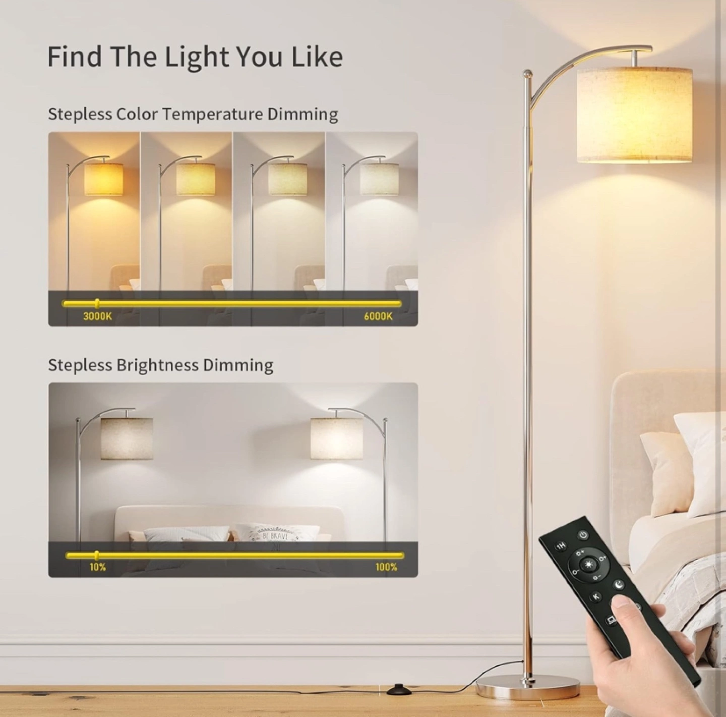 308Floor lamp with remote control, includes a white fabric shade. Adjustable brightness and color temperature.