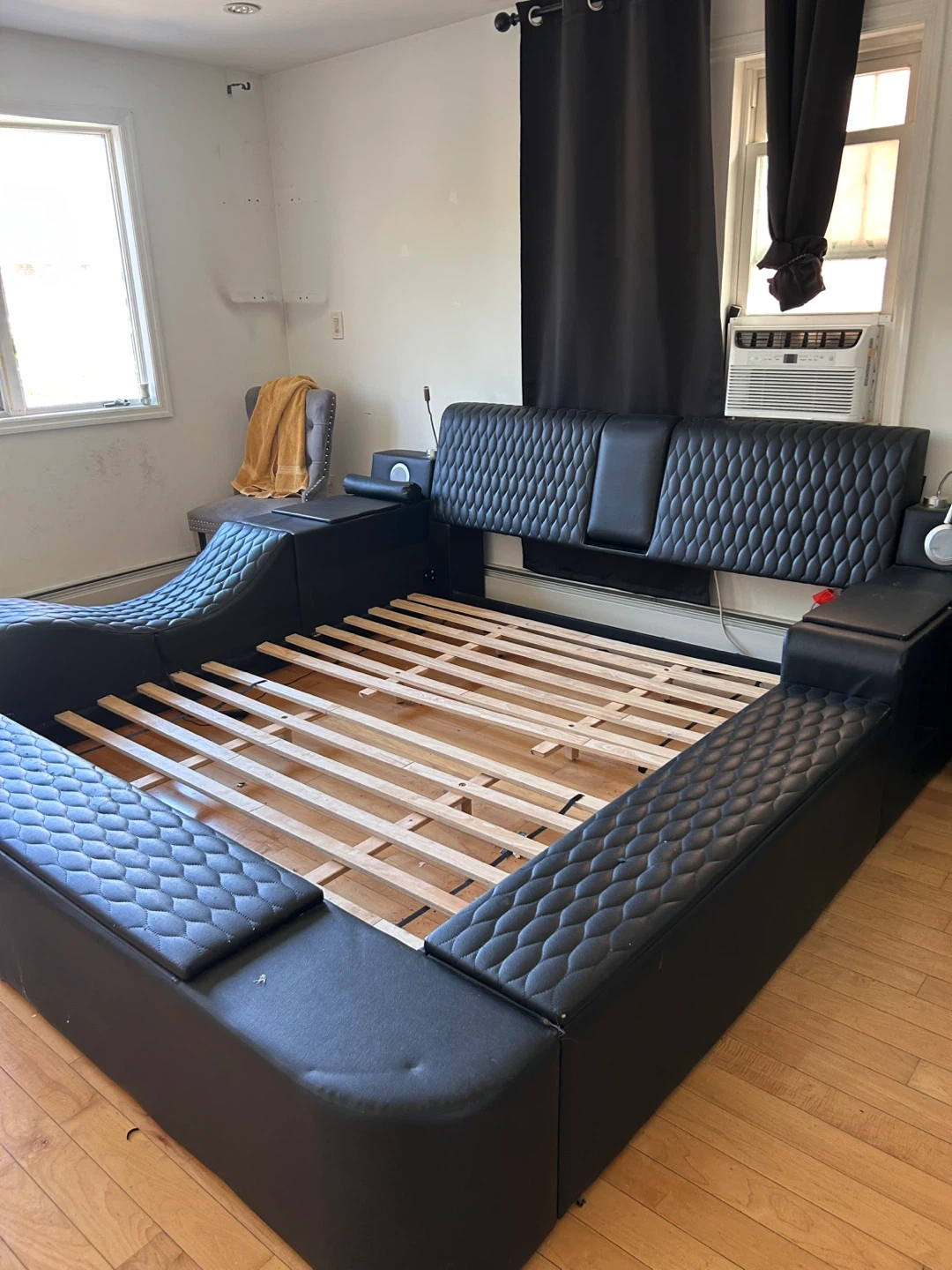 Selling a modern black platform bed frame! It features a unique design with a quilted headboard and built-in side tables. It's a great addition to any bedroom!