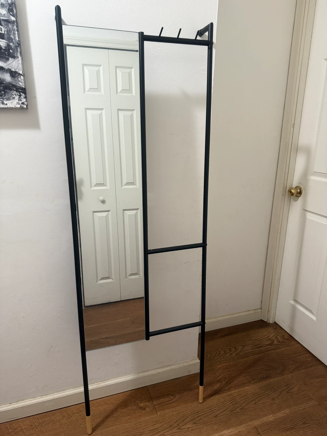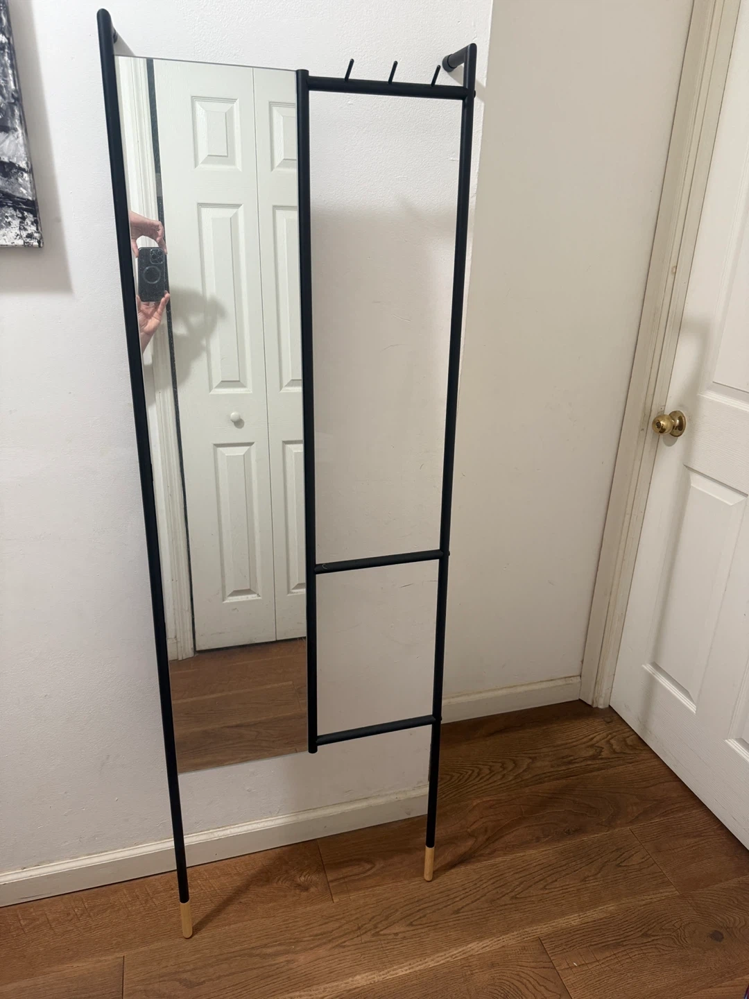 60Selling a modern standing mirror with a built-in rack. It's a stylish and functional piece, perfect for adding a touch of elegance to any room while providing convenient storage for clothes or accessories. The sleek black frame complements any decor!