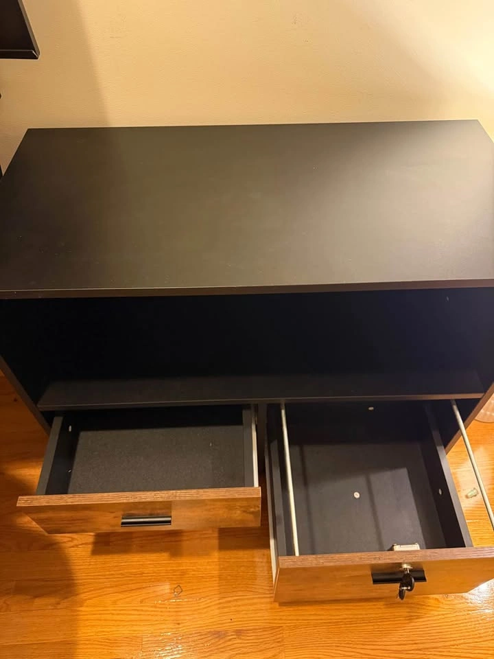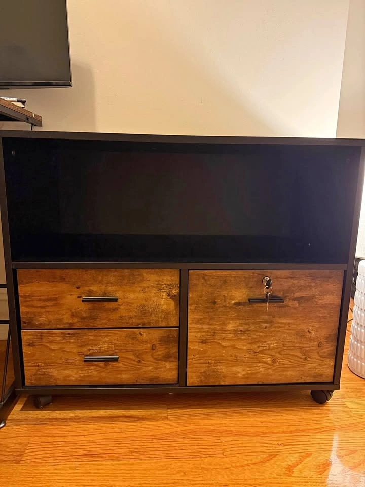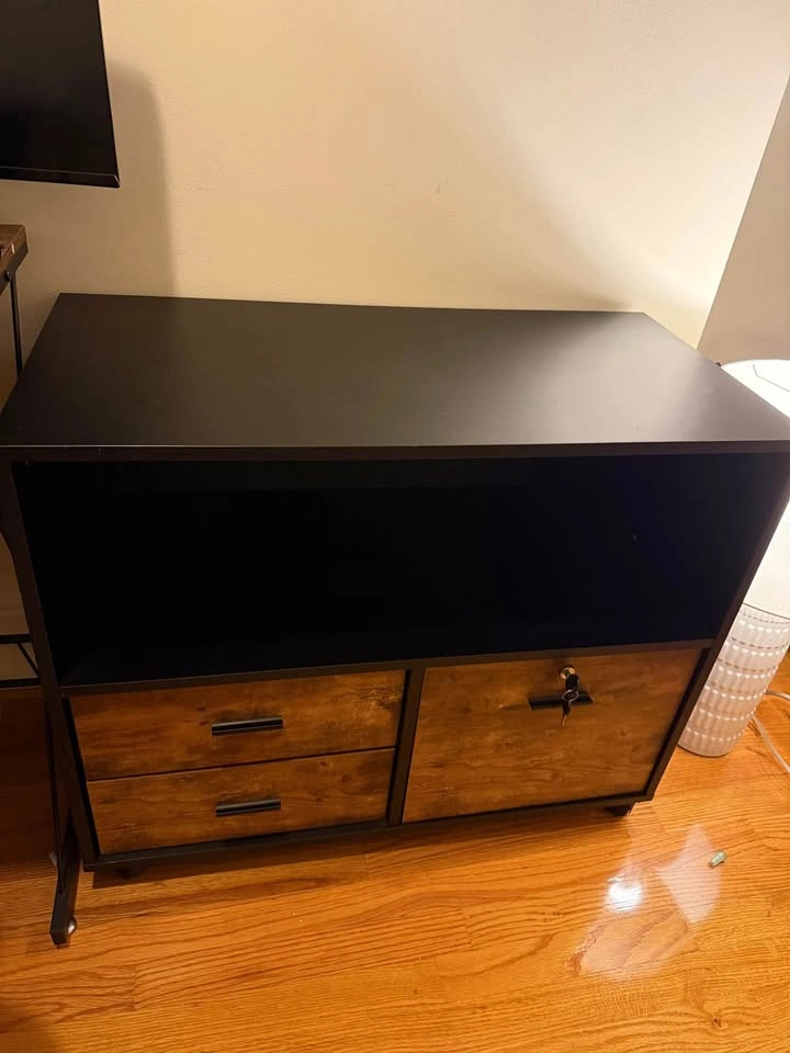 This versatile stand works perfectly as a printer stand, bookshelf, or media console. ✅ Dimensions: 32” L x 16” W x 26” H ✅ Features: • 2 smooth-glide drawers for books, office supplies, or electronics • 1 lockable drawer for secure storage (keys included) • Open shelf space for books, printer, or décor • Modern black & wood finish that fits any room style • Sturdy build with wheels for easy movement Perfect for home office, living room, or bedroom. Clean, gently used, and ready for a new home.