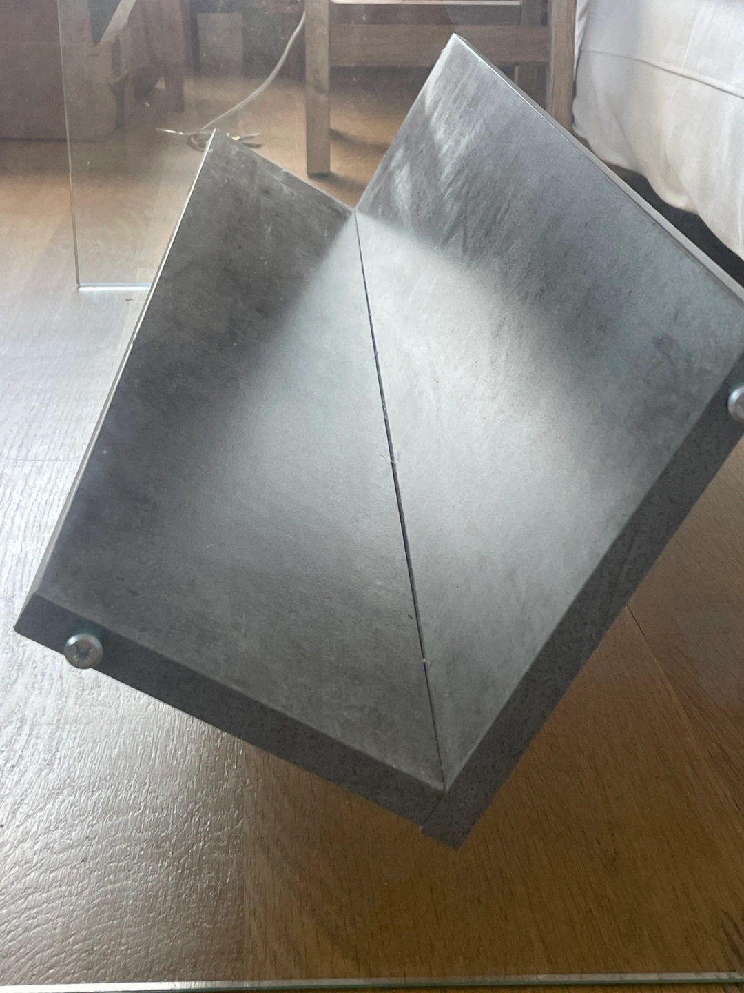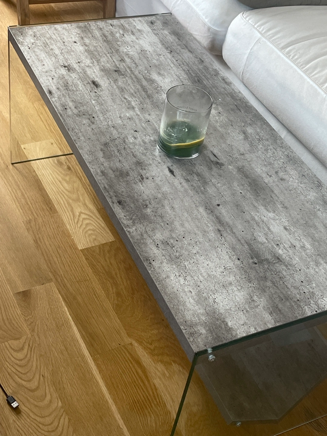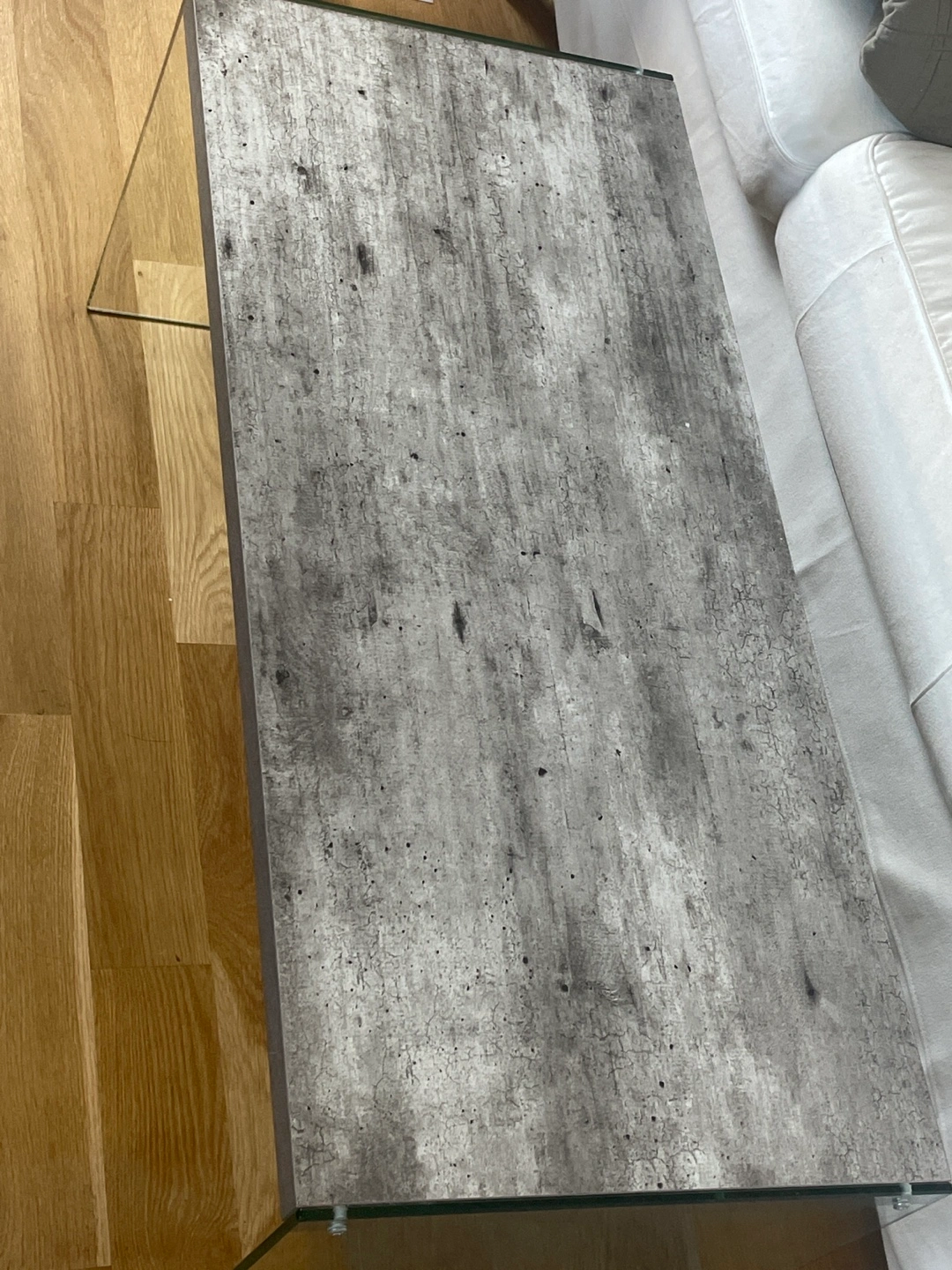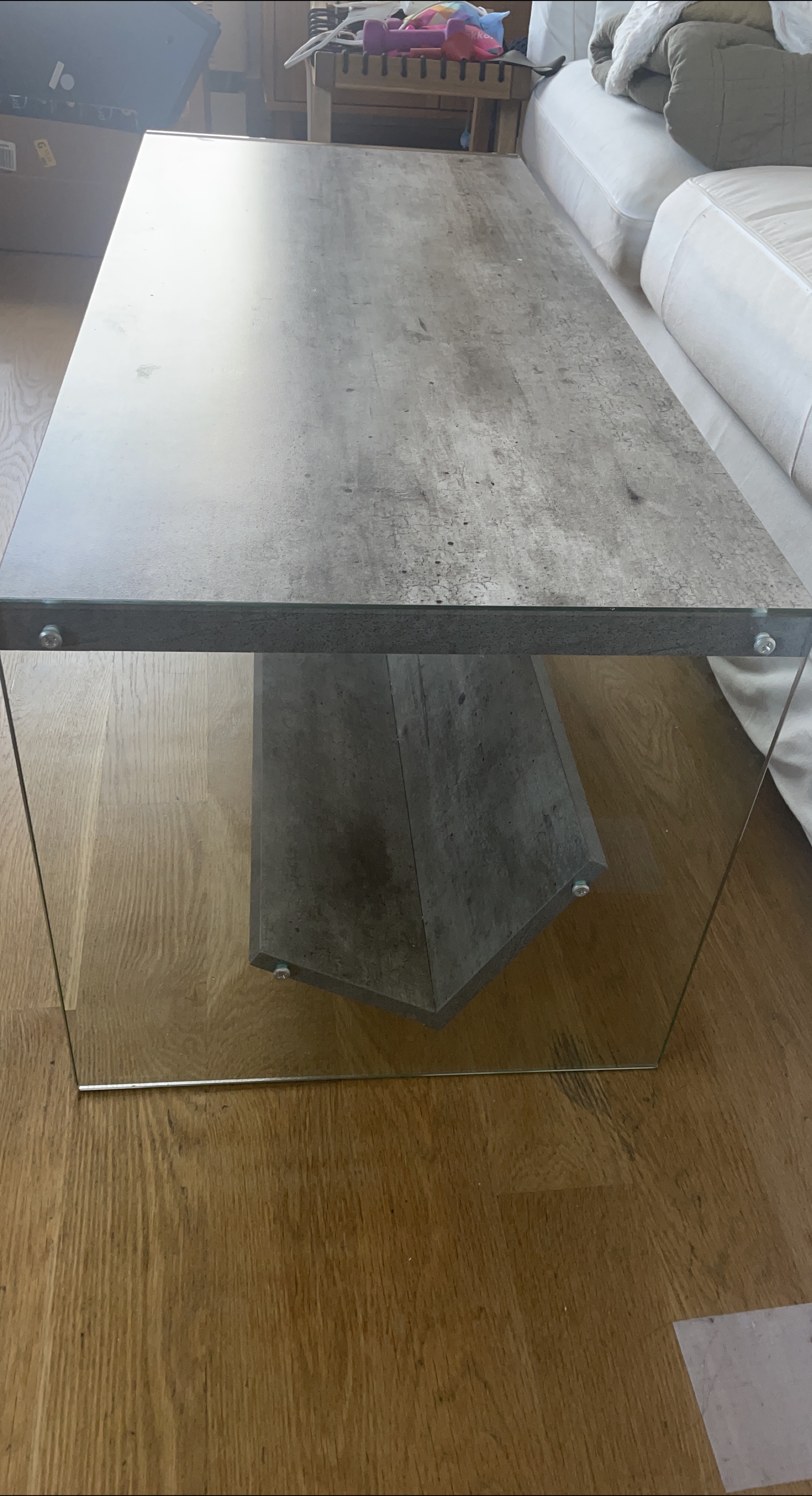 No damage at all - like brand new. Selling a stylish coffee table with a concrete-look top and glass sides. It's a modern piece that would look great in any living room. The base is a unique geometric shape, to hold books and others to be stored.